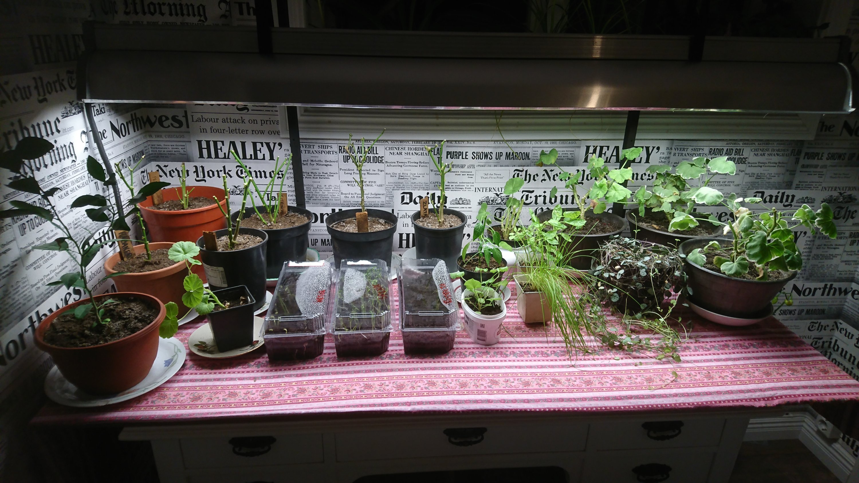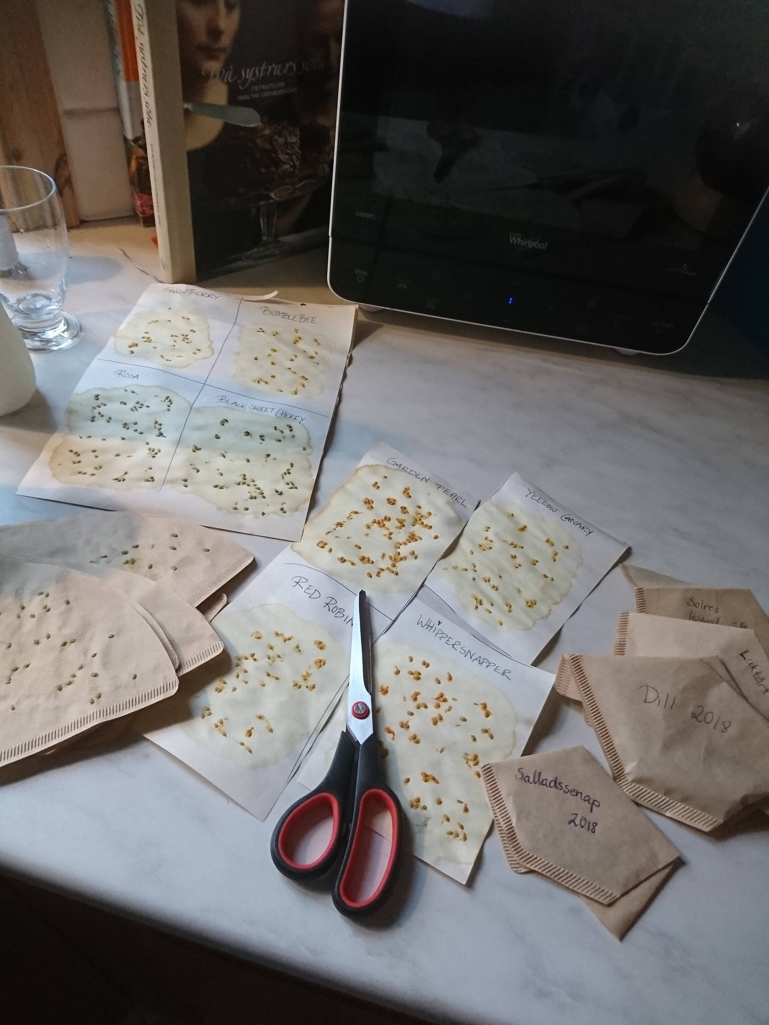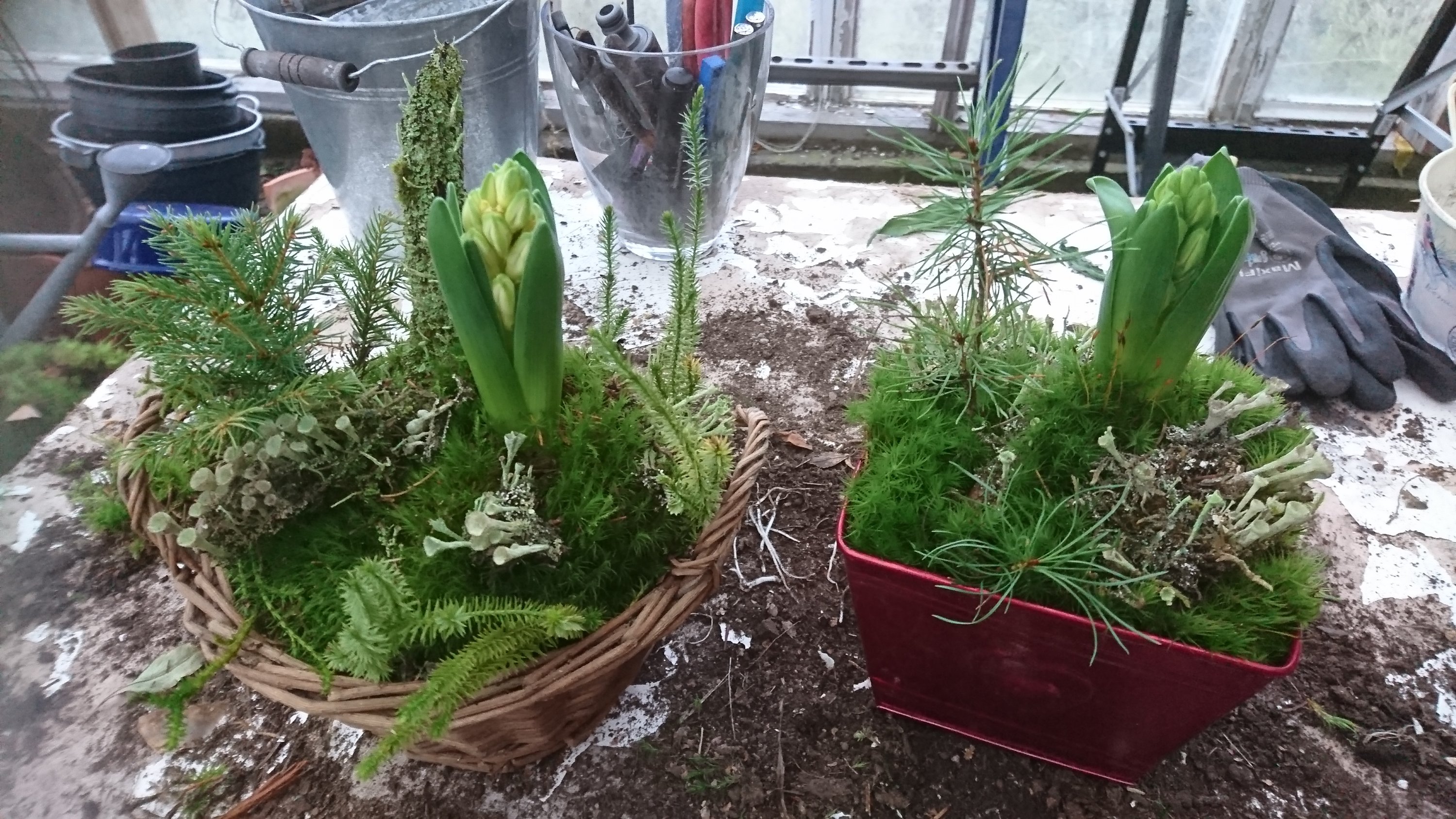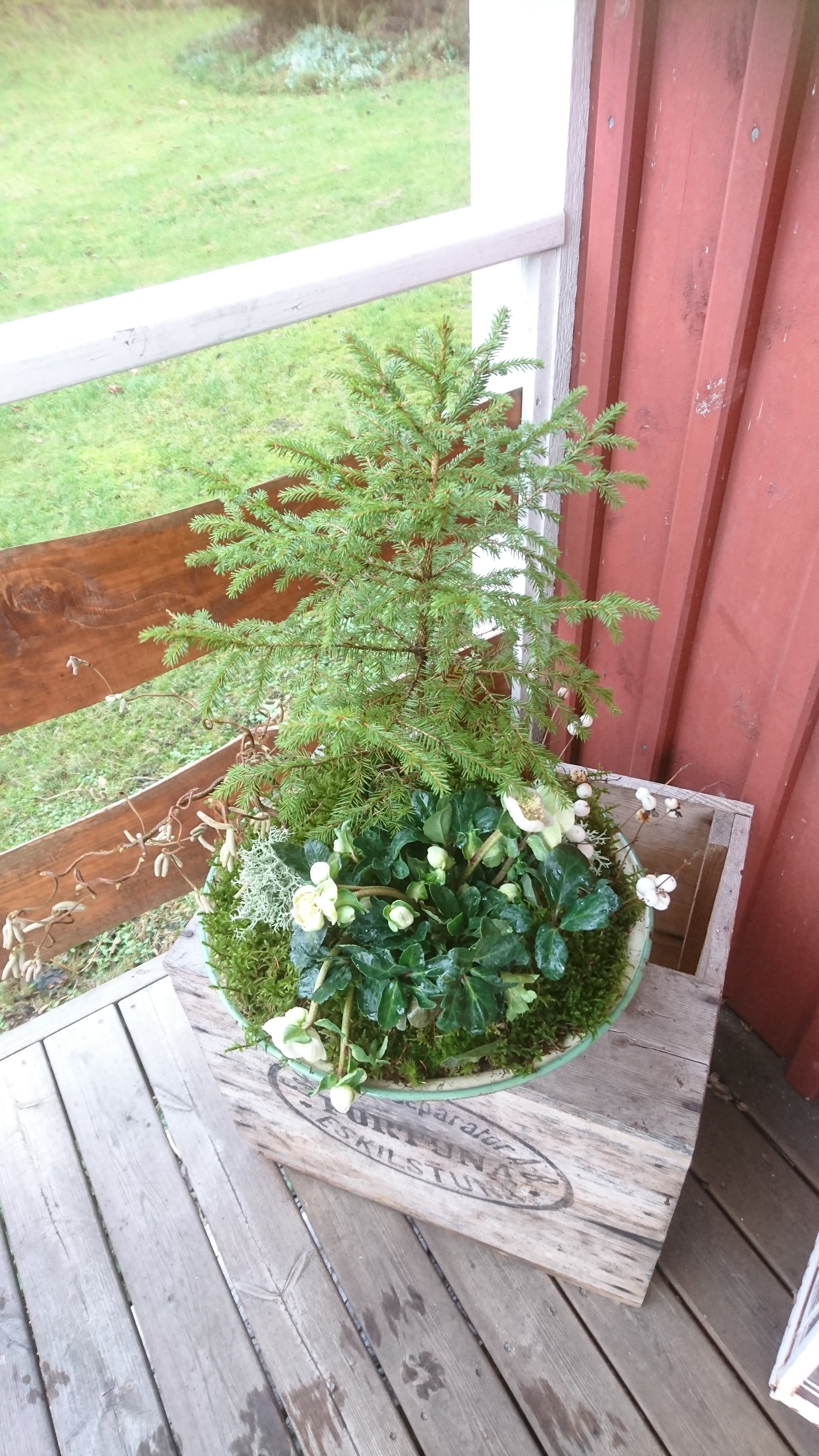 Så kom vi plötsligt till advent (alltid lika snopet). Dock välbehövligt, det är såå trögt med mörker all ledig tid, förutom helgerna då är man får komprimera all uteverksamhet till de få någorlunda ljusa timmarna. Sen dröjer det ju ett bra tag tills det vänder men det blir åtminstone lite lättare när man får ha lite glada ljusslingor kring sig. Den här helgen har det blivit adventspyssel med att göra några hyacintgrupper. Jag är väldigt förtjust i mossa men särskilt i lavar 💕 och har gjort till lite sport att inte köpa så mycket till grupperna. Hyacinterna var jag förstås tvungen att köpa men sen är krukor och korgar såna som jag nån gång köpt på loppis – varför köpa en ny när de är precis lika fina begagnade? Då kan man ju lägga pengar på det viktiga istället, nämligen blommorna. Den här gången var det hyacinter och en julros som inhandlades, till jul blir det nog lite fler. Jag brukar också ta skott så att det finns egenuppfödda gröna växter till grupperna, det är så himla roligt! Uteblomma med julros, gran, ormhassel och snöbär Innegrupper med gran, tall, hyacint, mossa, bägarlav och lummer. De nu (väl)torkade fröna har tagits omhand och kommit i sin skokartong. Och hör och häpna! Det är faktiskt några frön som kommit i jorden också! Medans jag ännu har lite tomater kvar från årets odling har jag sått fem frön av Garden Pearl (det ska bli fyra plantor). De ska få stå under lysrör som jag också fått upp igen 😃 Märkligt nog blev det knökfullt på en gång. De stolkiga chilisarna som jag tar bort blad på så fort de visar sig, jag försöker ju svälta ut bladlössen.. Pelargonerna som inte fick plats i fönstret när ljusstaken skulle te’, några skott samt två stycken frösådda pelargoner. De är enormt spännande, mamma är den kärleksröda storblommiga. Detta är verkligen inte likt mig, jag brukar tycka det är så skönt när man stänger ihop växthuset och inte tänker odling på några månader. Så icke i år. För en vecka sen när jag köpte smörgåsar på Ica fick jag dom i en sålåda och insåg att det var ett tecken. Jag sådde spenat, rödbeta och ärtor för att kunna få lite eget grönt nu när man måste köpa ända från Spanien. För ett par veckor sen togs de sista potatisarna upp. Jag är faktiskt väldigt nöjd med dom, så lätt att odla och så goda. Nästa år… 🥔🥔🥔🥔😁