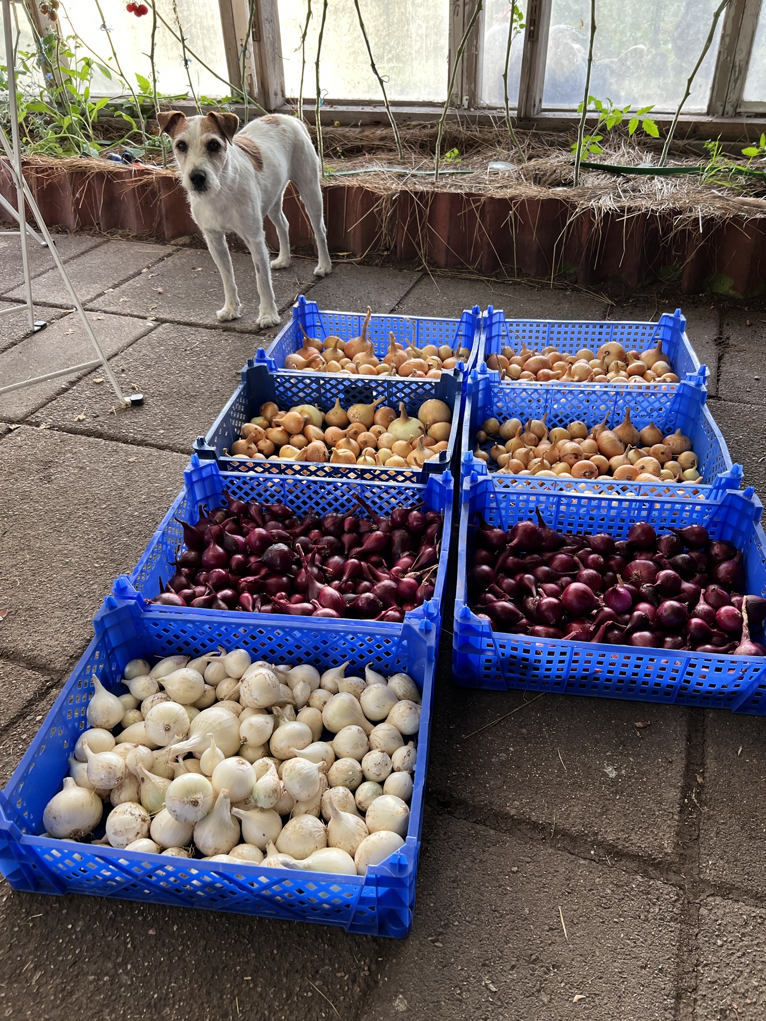 Jo, det blev en hel del ganska fin lök. Sen undrade jag ju vad jag gjort när jag satte dem i våras. Jag hade köpt alldeles för mycket utsäde; 900g av vardera gul och röd lök samt 300g silver. Note to myself; som man sår får man skörda.. Det var inte bara att det tog stor plats och tog lång tid att få ner all sättlök, det tog också en god stund att skörda och rensa den efteråt..