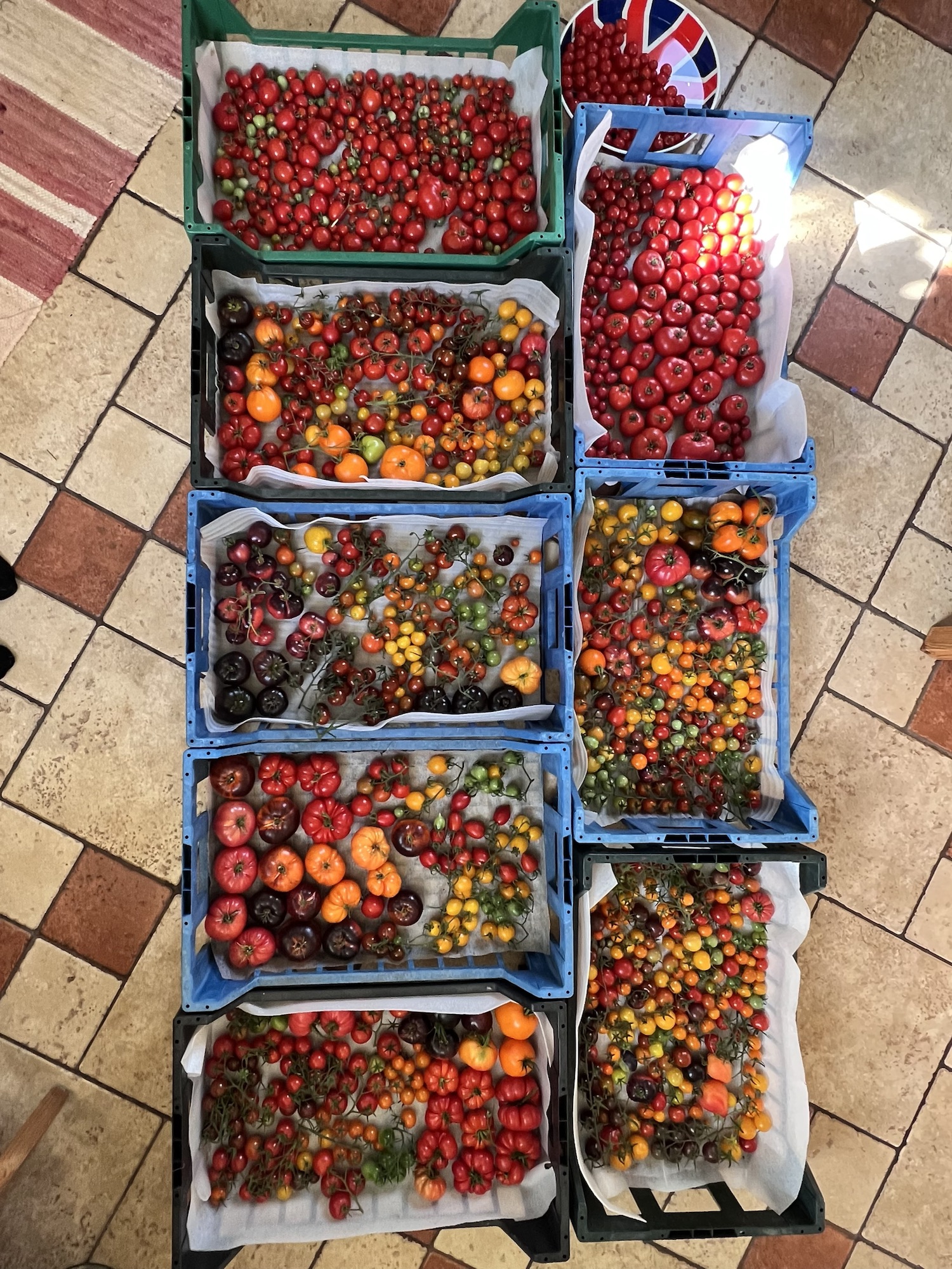 Åter till tomaterna, totalskörden får man ändå vara mer än nöjd med; 93kg, och då kommer 44kg från utomhusodlingen. Trots att väldigt mycket av det som såg så lovande ut i lannet gick bort pga bladmögel. Ytan för de 44kg är ca 11×0,5m vid husvägg (öster och söderläge), dubbla rader med plantor vanliga busk längst in vid väggen och ampelsorter längst ut samt 2×0,7m i lanne med ampelsorter. Detta är väl ändå fantastiskt bra?!