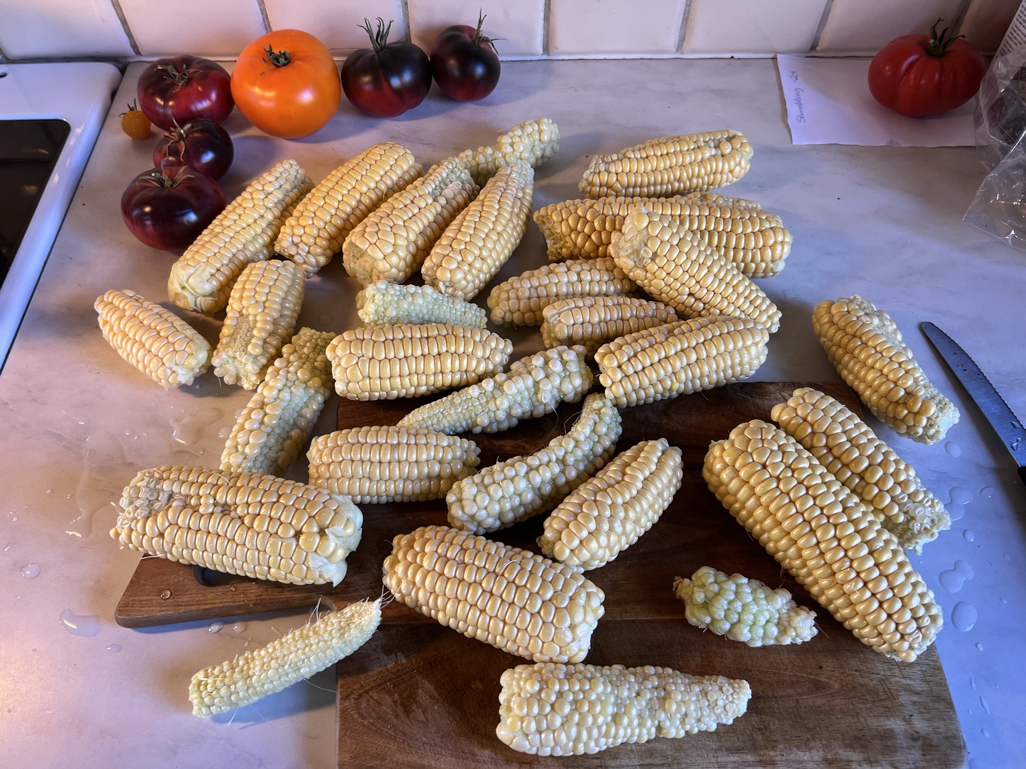 Oj vad det är gott med majs!!! Årets skörd blev inte så stor men det anades ju redan när fröna sattes. Det var ju så små portioner i påsarna jag köpt så det blev pinsamt. Jag hade gjort mig redo för att så ordentligt med frön och köpt på mig nog tre-fyra påsar. Tror att jag räknade till 16 frön/påse. Snålt! När jag väl sått dessa kom jag aldrig till skott med att handla fler och det landade på ca 45 plantor, som i sin tur blev till drygt 30 majskolvar. Inte helt fyllda men h.e.r.r.e.g.u.d. va goda de är! Det gäller tydligen också att koka/förvälla dem typ på dirren efter skördandet för att sockret i dem inte ska bli stärkelse (tror att det var så jag läste). Några hamnade i magen och några i frysen. PÅ listan till nästa år står det; STORPORTION AV UTSÄDE TILL MAJS!