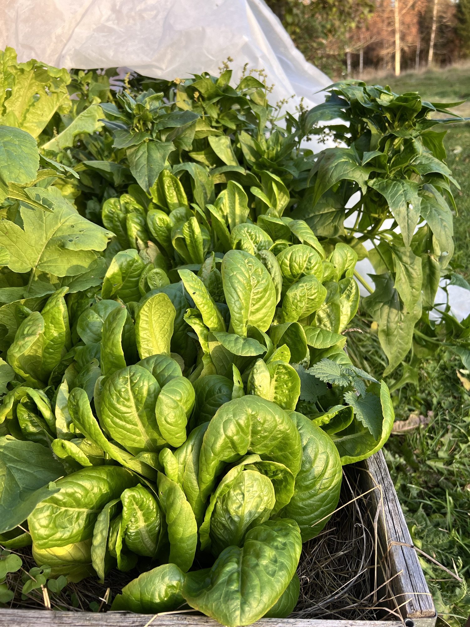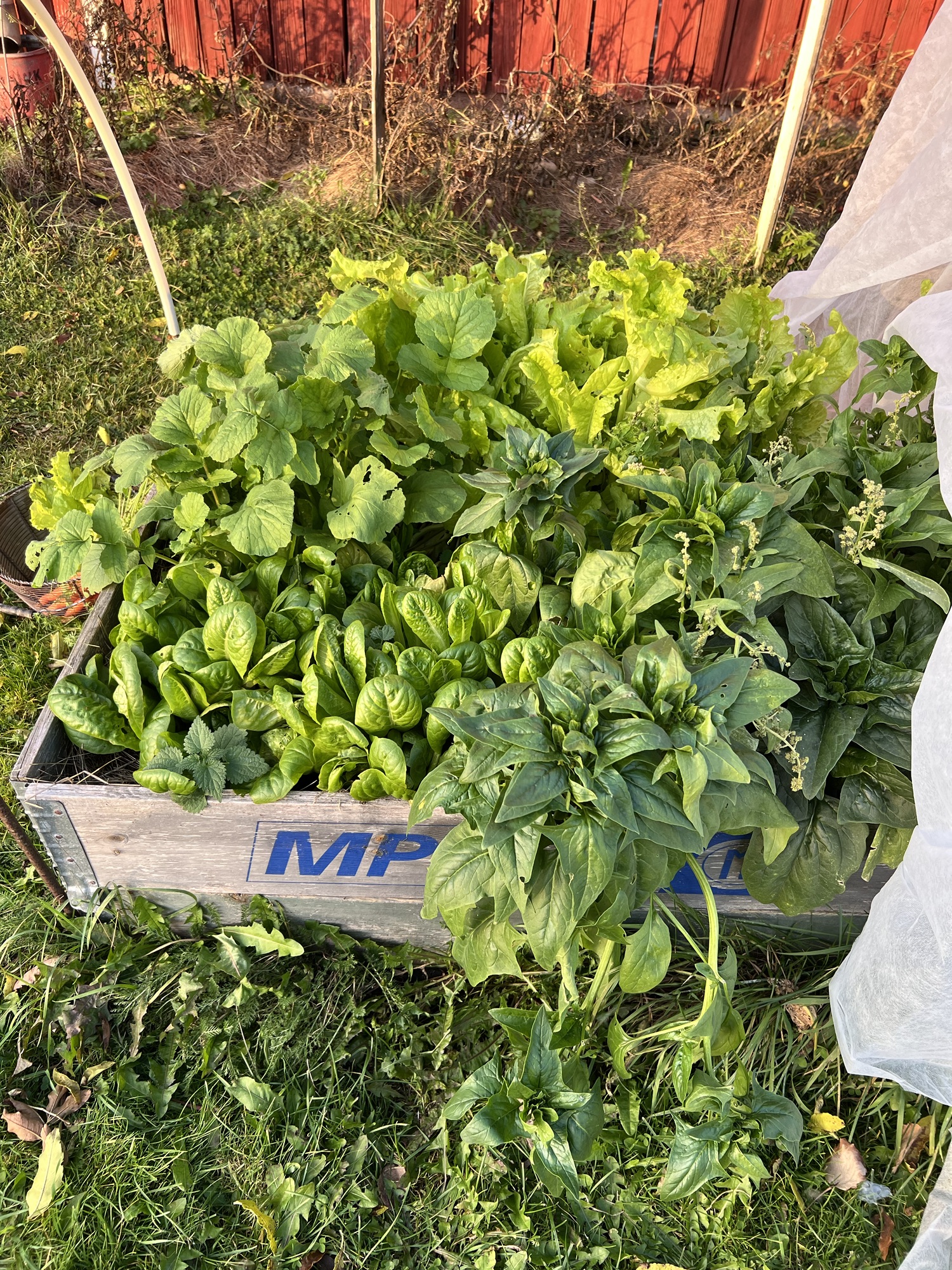 Ett lyckat drag av odlingen som inte alls var jobbigt vara att kasta ner lite frön av bladgrönt där vitlöken togs upp. Jag satte spenat, pak choi, rädisor, Little Gem-sallad och en grön plocksallat. Nu i oktober har jag lagt fiberduk över lådan och kan skörda finfina blad till sallader. Rädisorna har eg förvuxit sig men igår när jag testade dem var de väldigt mjälla och fina. Kanske beror det på att hösten är mycket mer fuktig och det är det som gör smaken mjukare. Dessutom blev det en kupp till middagen av dem (eftersom ingen mer än jag tycker att de är goda). Skivade en stor rädisa fint med mandolin och hällde över en sockerlag, tänkte att: går det med ingefära måste det väl gå med rädisa? Och jodå, den fick med beröm godkänt. Märkligt hur bra det smakar bara det är lite sött… 🤭 För sallat har det verkligen varit en bra sommar, jag har haft eget grönt i princip hela sommaren, plockat av, sköljt upp och lagt i plastpåse i kylskåpet så har det stått sig fantastiskt bra.