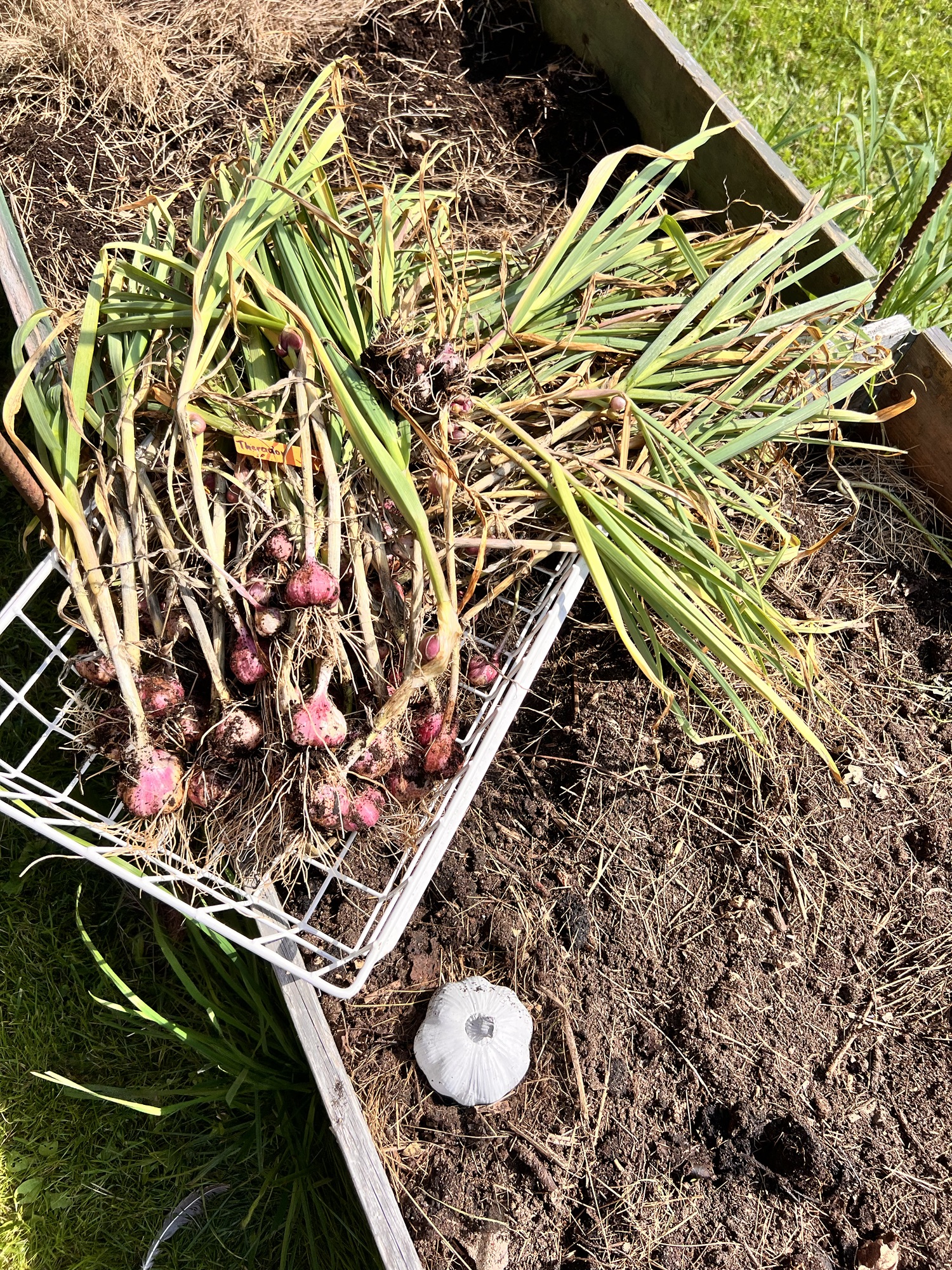 Årets vilöksskörd blev bra. Konceptet är nog att inte sätta för tidigt (den ska inte hinna börja växa innan det blir kallt). Jorden behöver vara rejält gödslad (komposten tömdes typ rätt i odlingslådorna där löken skulle ner strax), sen ska det fyllas på med gödning exakt hela tiden. Här har det lagt på både hönsskit och dessutom vattnat med nässelvatten så ofta jag kommit ihåg. Jorden har varit täckt av hösilage hela tiden. Sen kan man inte påstå att det är några enorma lökar men ändå schyssta för ekologiskt och hemodlat tycker jag. Sorterna jag hade var Therador och Sabagold.
