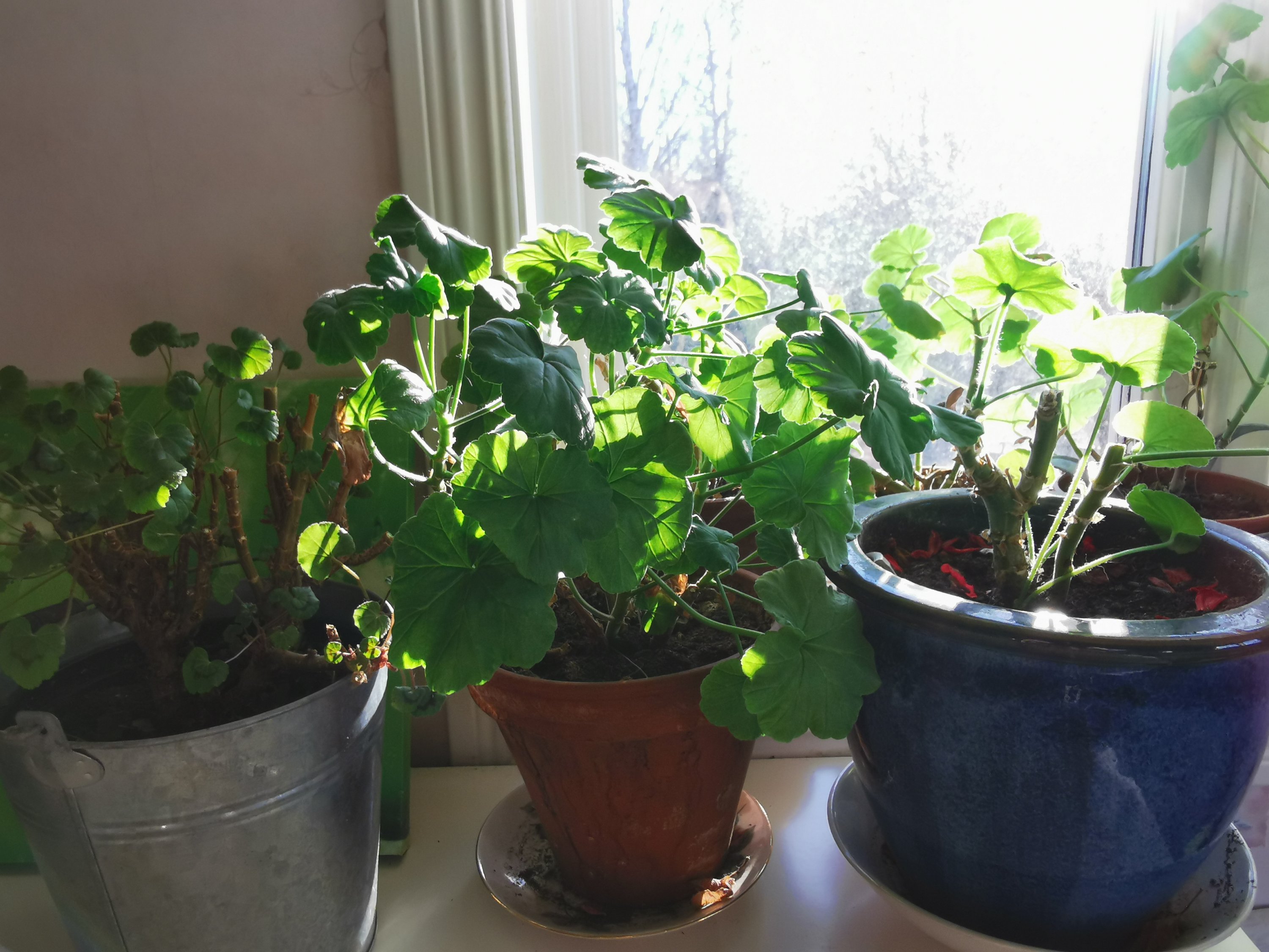 Tre nedklippta pellisar, t hö Bigitta, en av förra årets egna hybrid. I mitten tror jag det är den som jag kallat Lill-pelargonen.