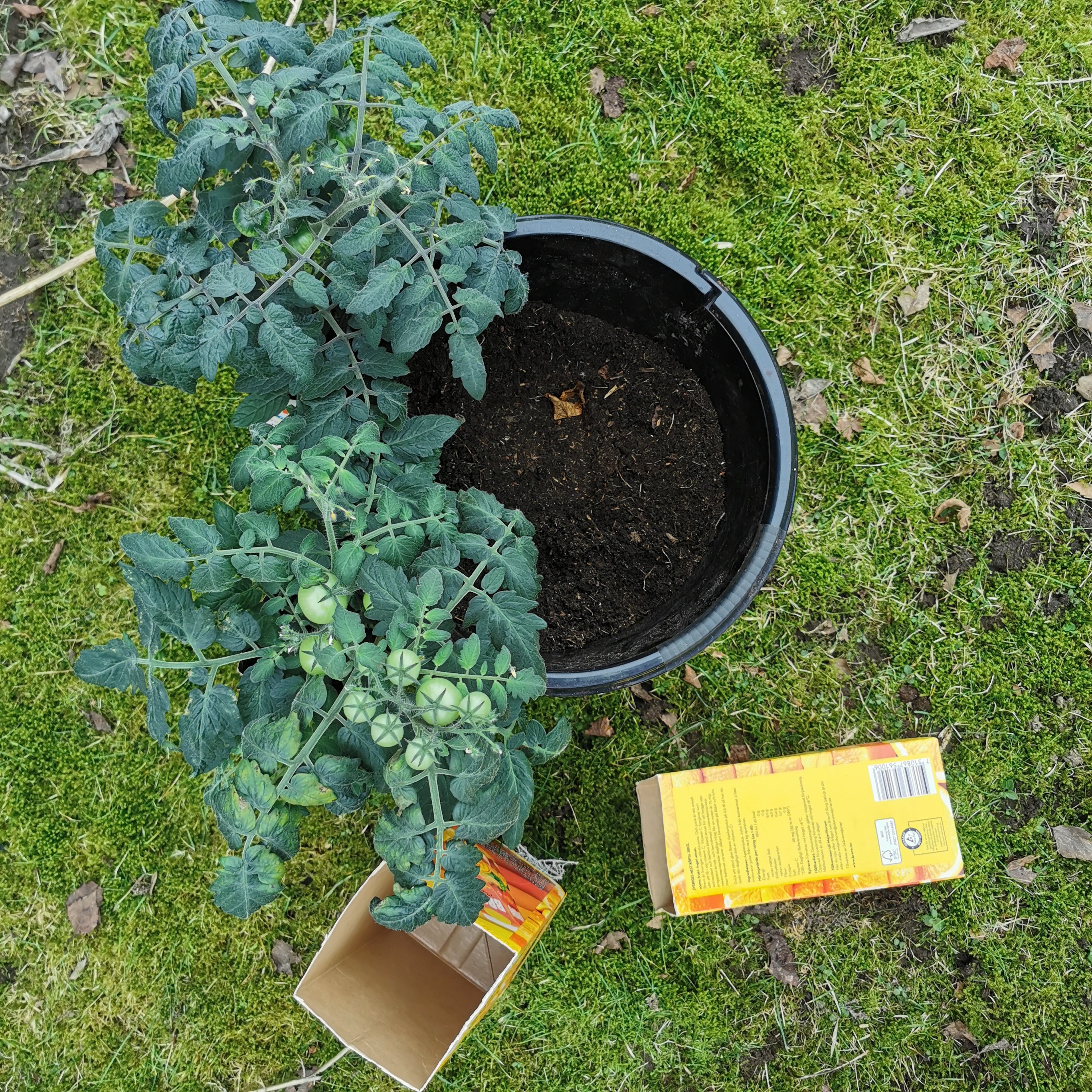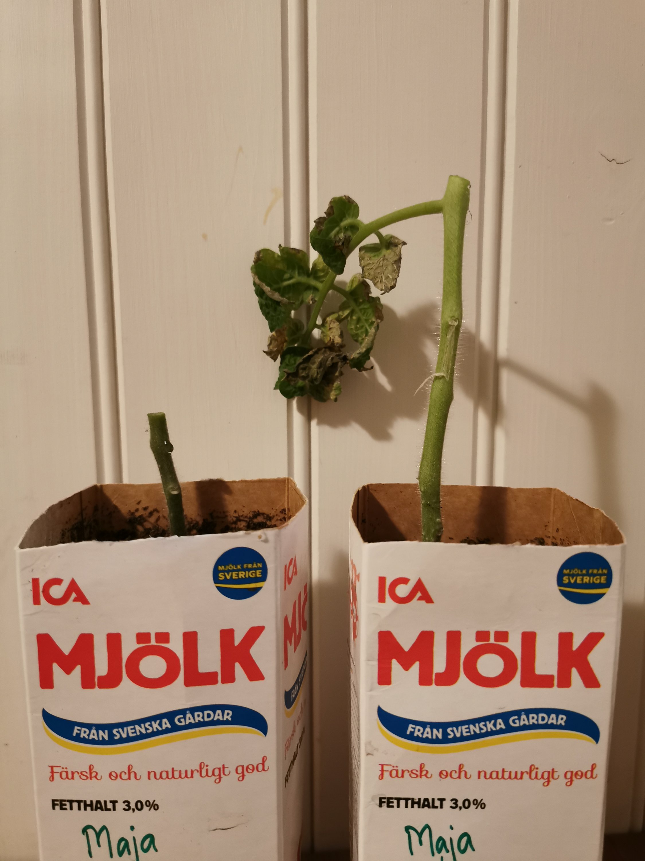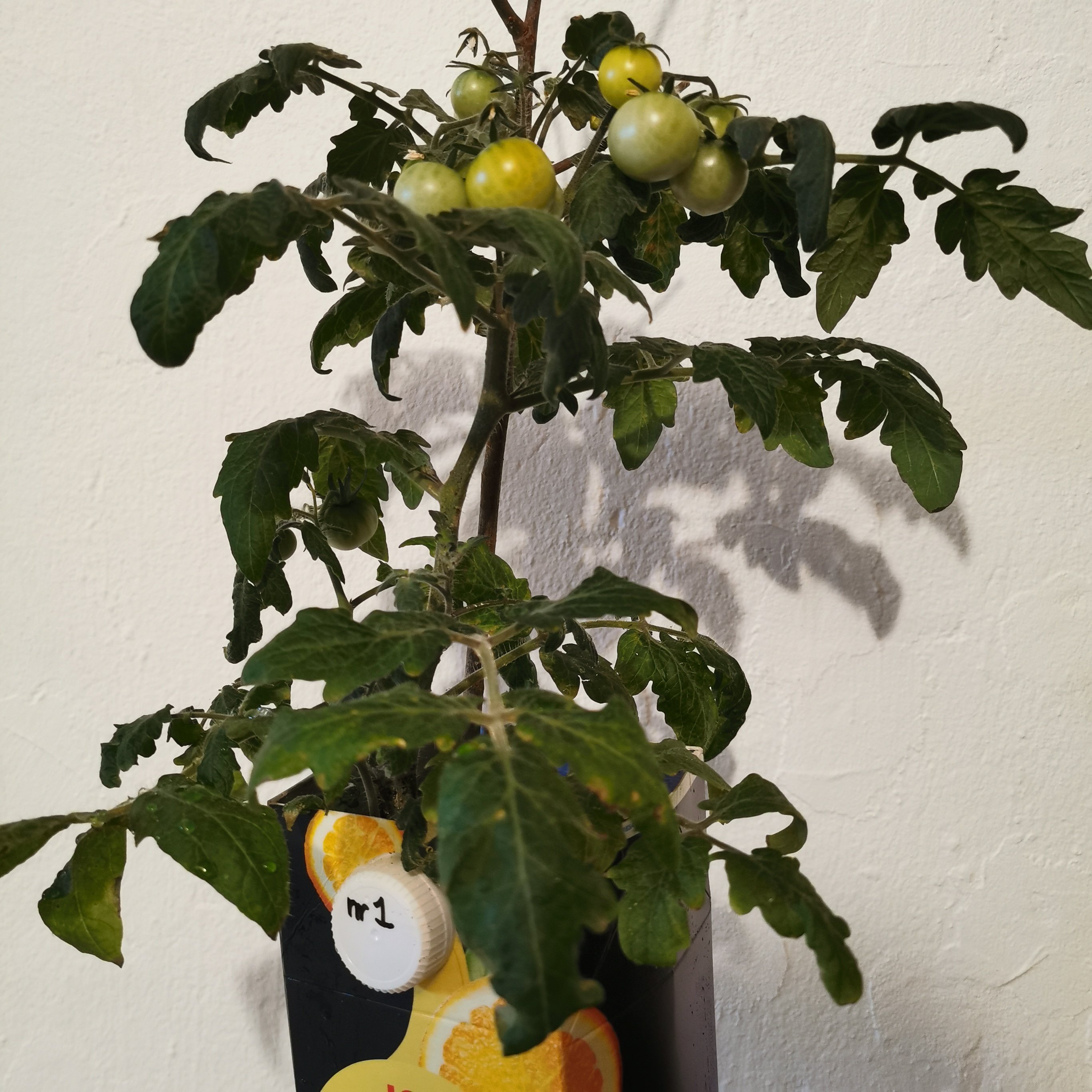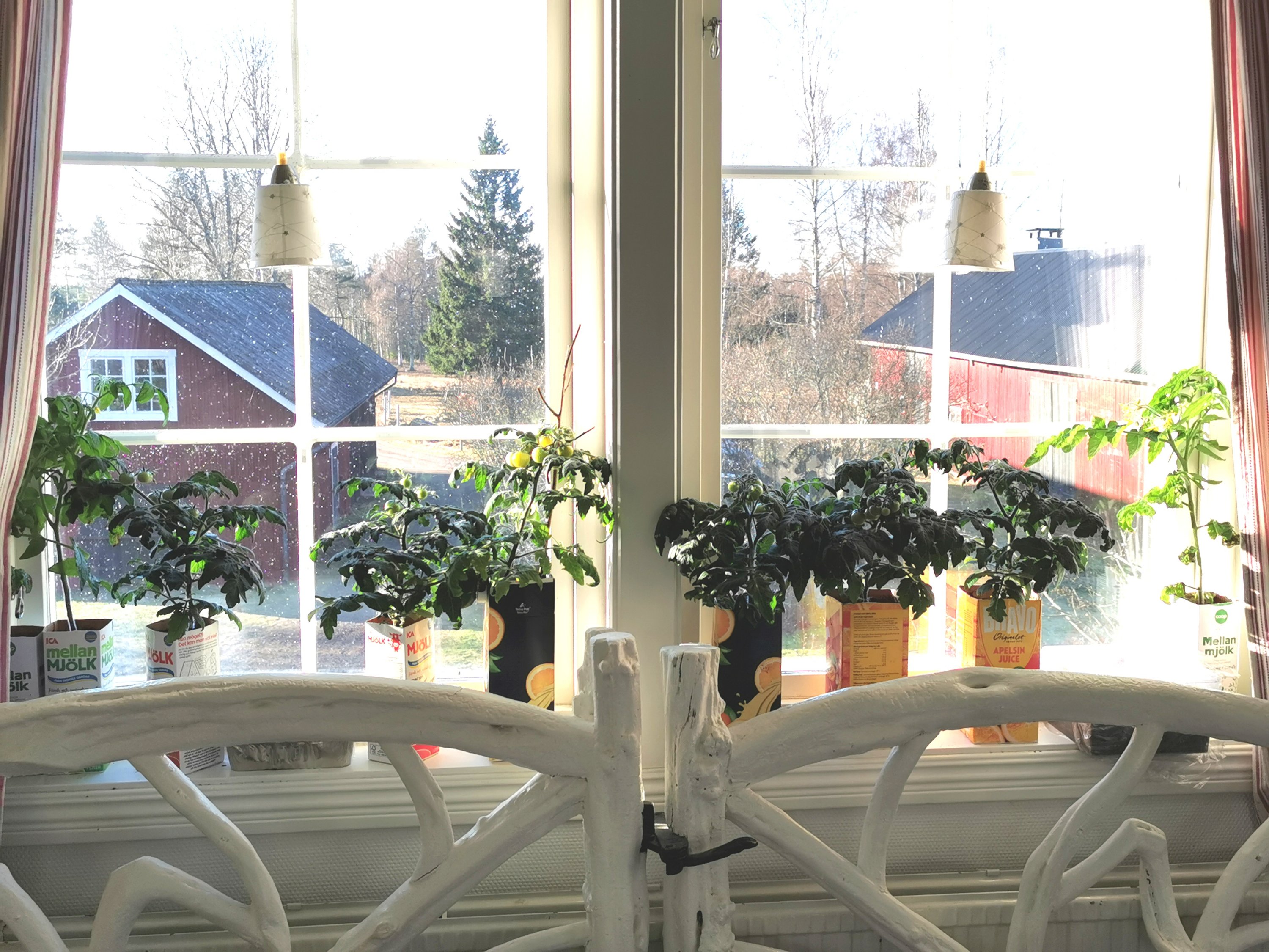 Tomatplanta No1 och några av de andra fönstertomaterna har fått lite större kruka, nu har de 2 liters jospaket att bo i och har också fått flytta till fönster. Och ja, No1 är också först med att börja bli klar, nu går tomaterna åt det gula hållet och jag misstänker att spontanfröplantan är en Yellow Canary. Jag är också lite vågad och har gett dom jord från egna jordfabriken. Tomaterna som bodde i det förra sommaren ute gillade det ju jättemycket så nu hoppas jag att det blir samma för dessa. Jag lägger alldeles för mycket pengar på jord och dessutom tycker jag att plantor som står inne så snabbt förbrukar det som finns i köpejorden? Inget jag har några belägg för men det känns så.