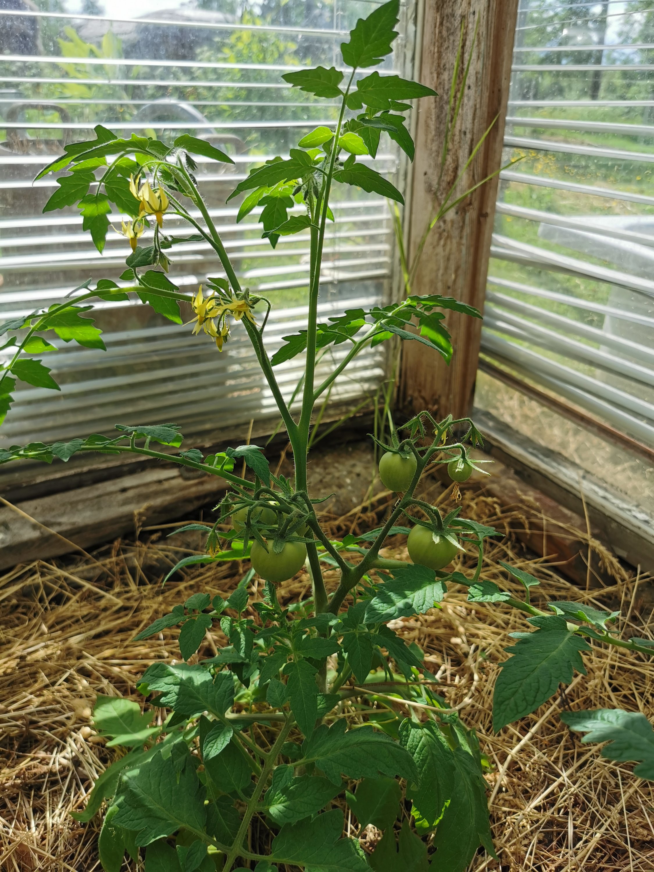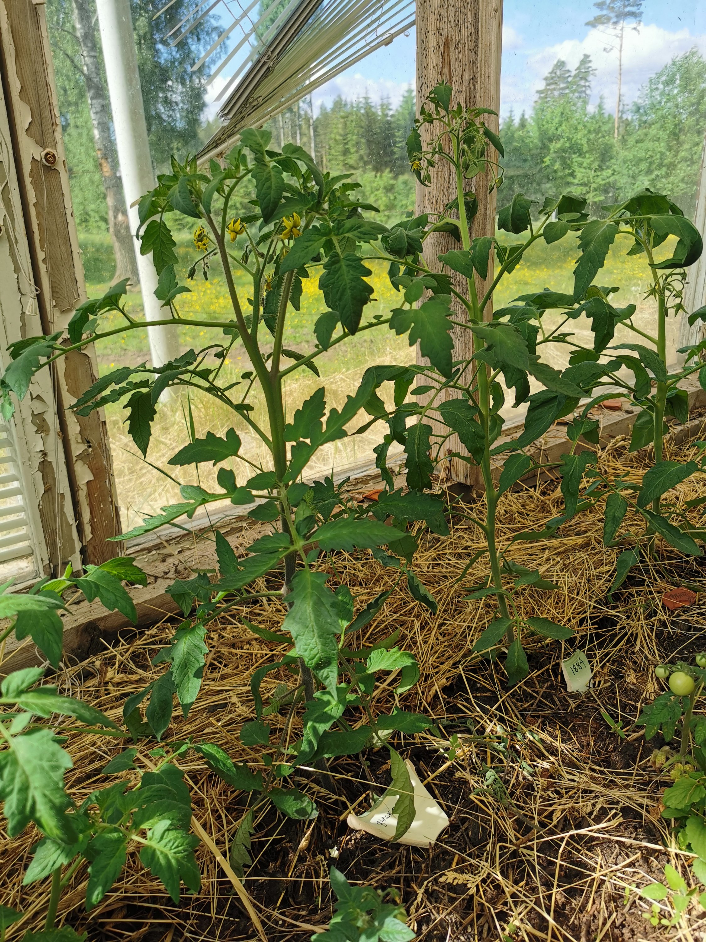 Och tomaterna gillar uppenbarligen att bo i nästan ren hästskit – det växer som attan – och blommar! Annars finns ju en risk att det bara blir en massa blad om det är för mycket gödning. Det jag gjorde var att gräva runt det gamla och nya, jag strödde på lite av en blandning av vedaska, benmjöl och magnesium innan planteringen. Nästa steg är att lägga på lite hönsskit och sen täcka med hösilage för att hålla fukt och tillföra lite långsam näring.