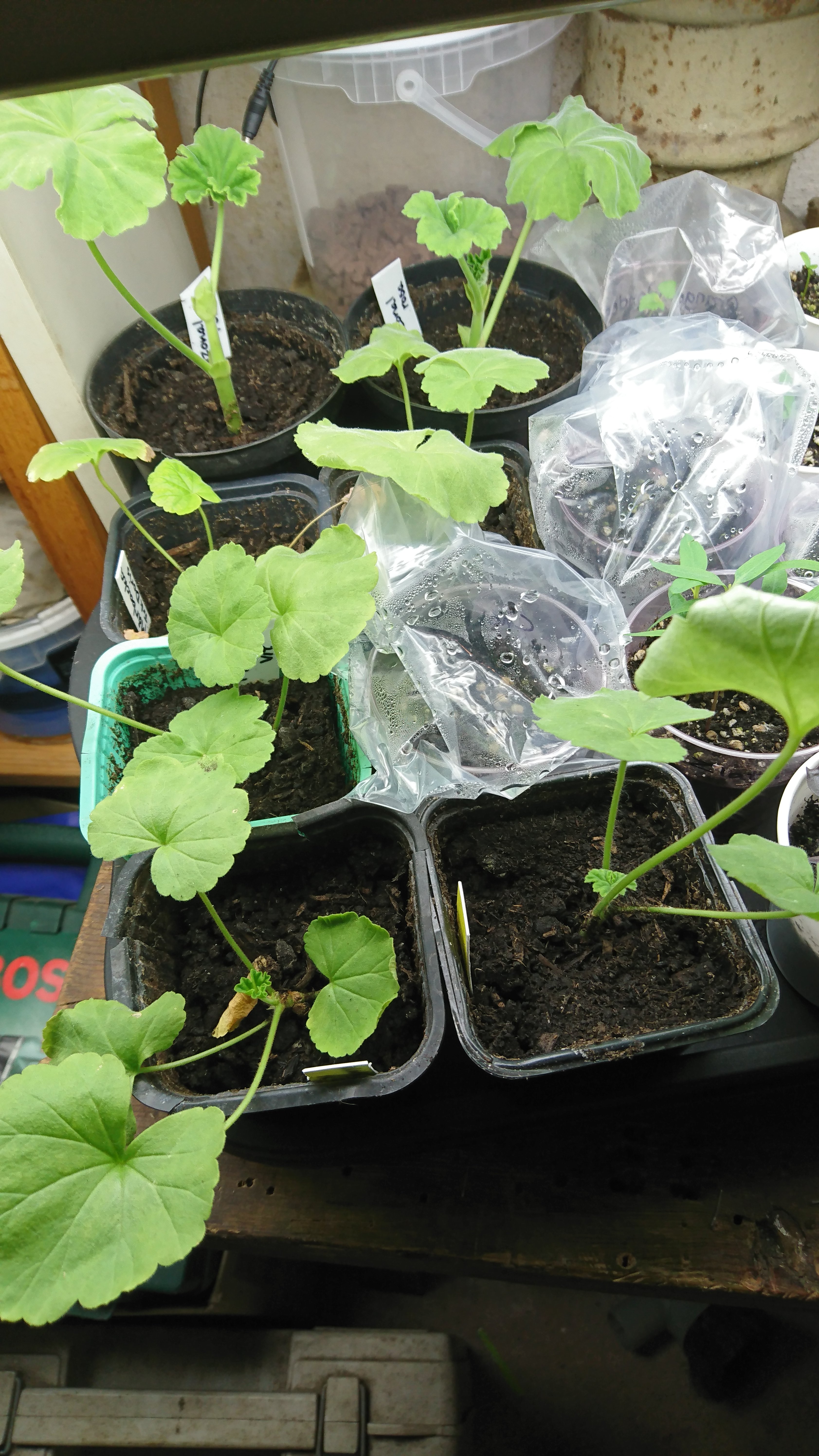 och jag tror att sticklingarna av pelargon har börjat rota sig. Hittade en pÄse sticklinghjÀlp som lades pÄ lite av i varje kruka. Egentligen skulle de ha doppats i det vid sÀttning men det visste jag ju inte dÄ, de ser iaf ut att ha tagit det bra.