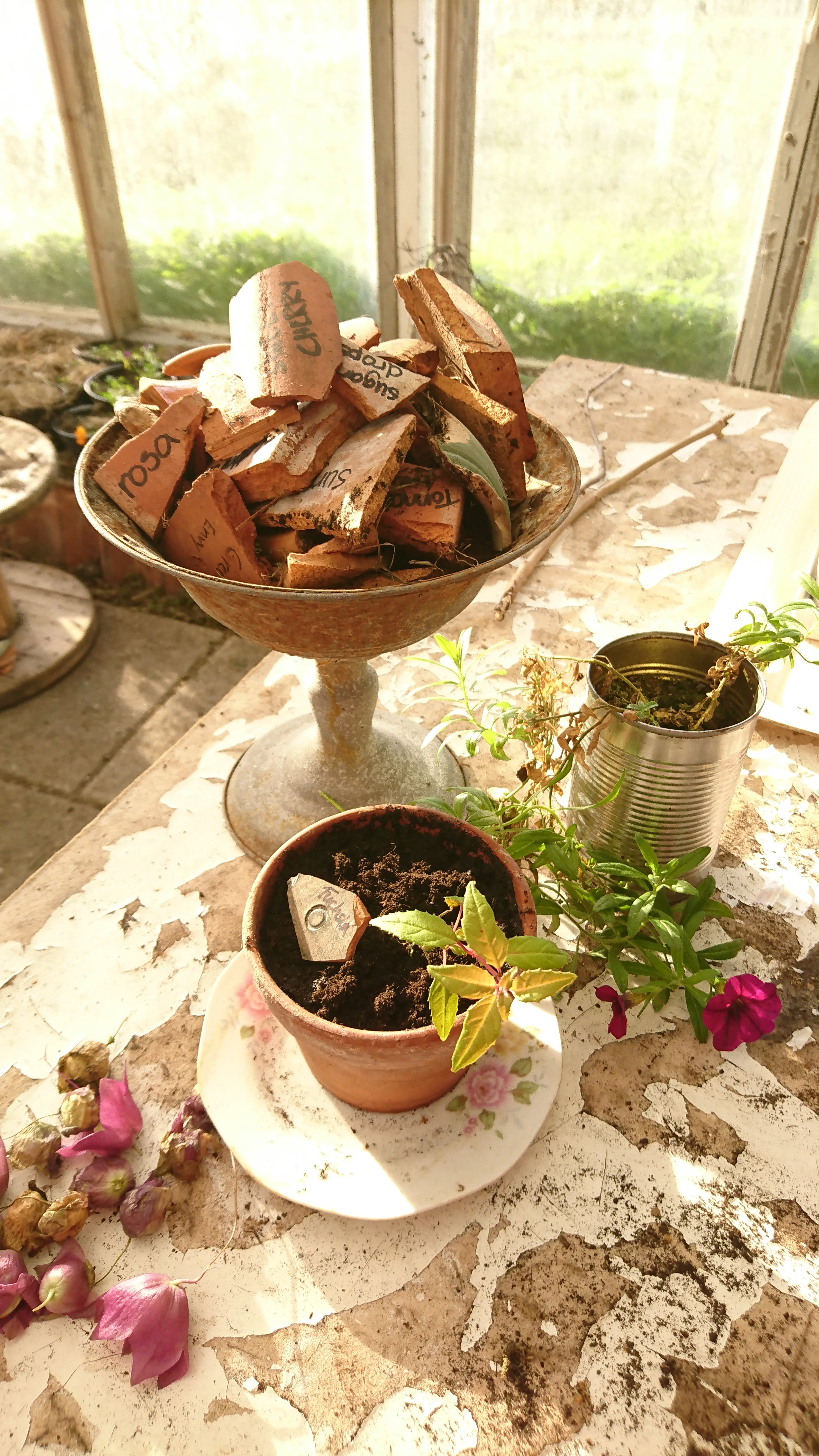 De frösådda små fuchsiorna ligger även de inbäddade, alla utom en, den hade överlevt frostnätterna och får följa med in. Jag finurlar på vilka enar som grott, det är åtminstone två olika sorter. Småblommiga är min gissning pga de små bladen och den röda stammen.