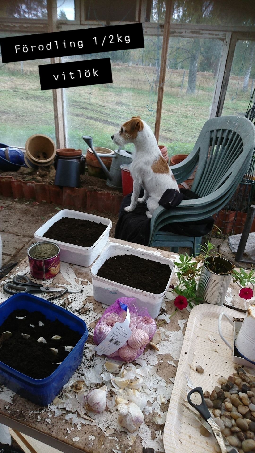 Stoppade ner lite vitlök i jord och hoppas. De ska få stå i växthuset.