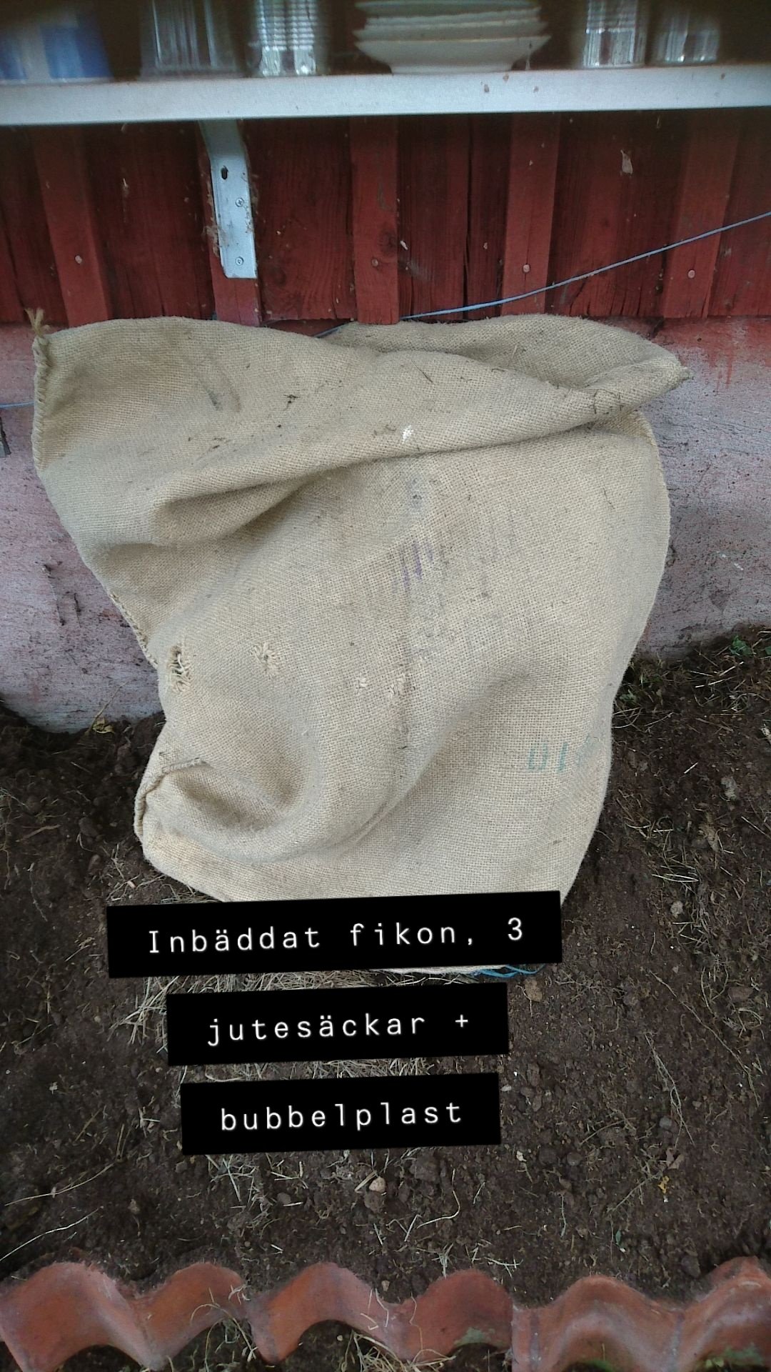 Fikonet har fått bubbelplast, 3xjutesäck, nergrävning och torrt gräs. Jag vill väldigt gärna att det ska överleva.