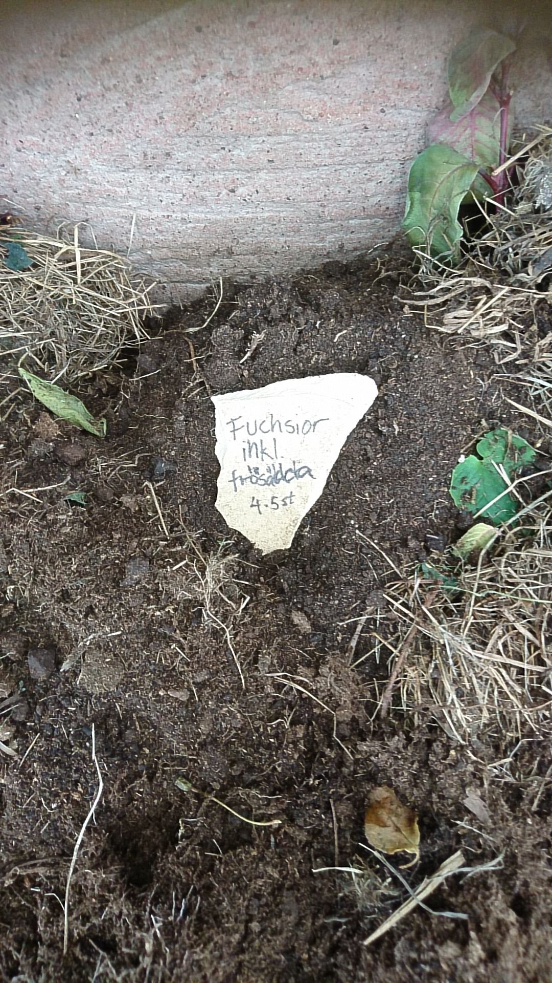 Nåväl, fuchsiorna har nu grävts ner i växthuset á la konceptet från försöket förra året. Djupt ner i bädden vid väggen, ur krukan, skaka bort jord och täck över med jord och torrt gräs. Ordentligt. Det är bästa metoden jag använt mig av so far, så så får det bli.