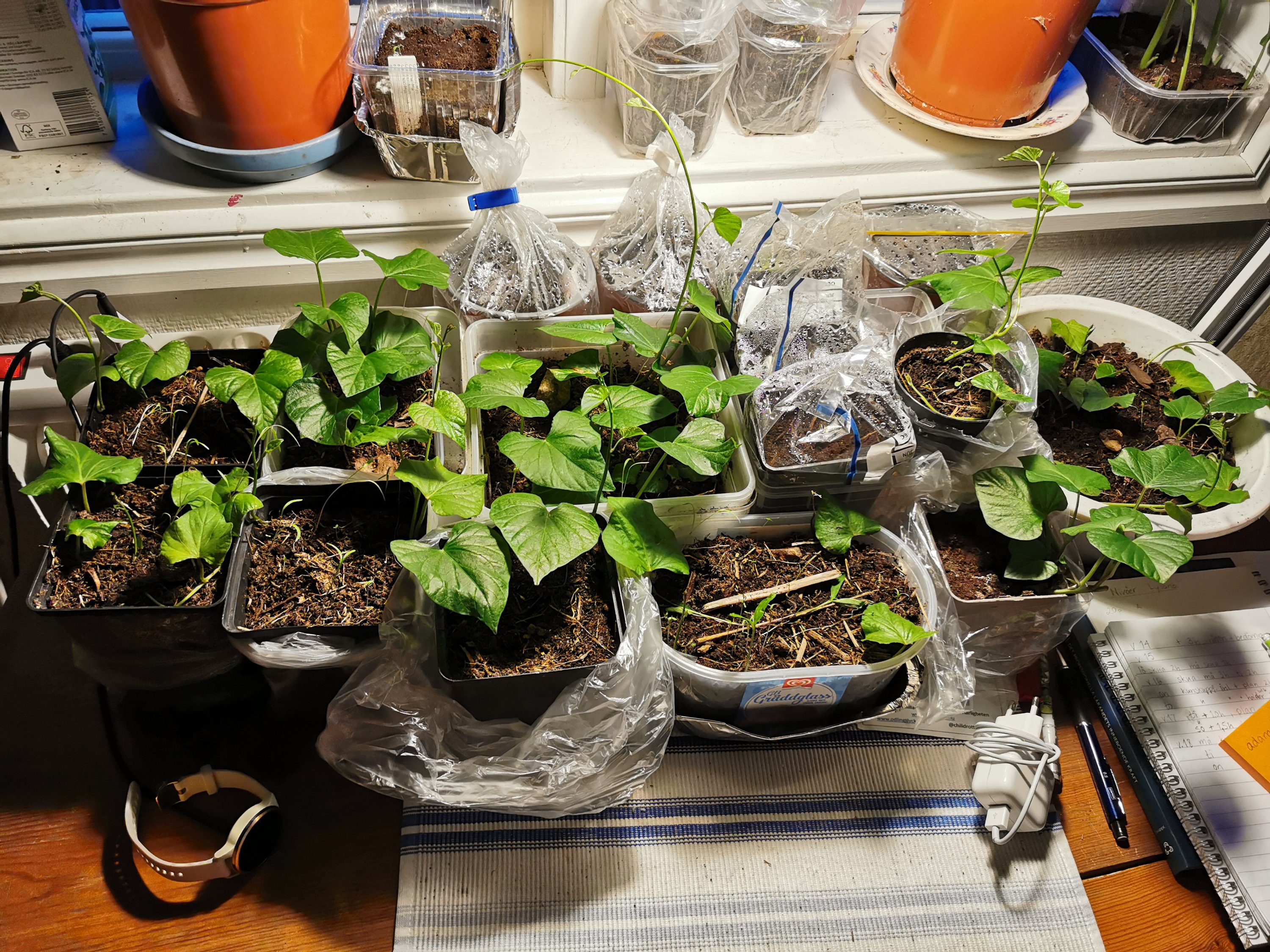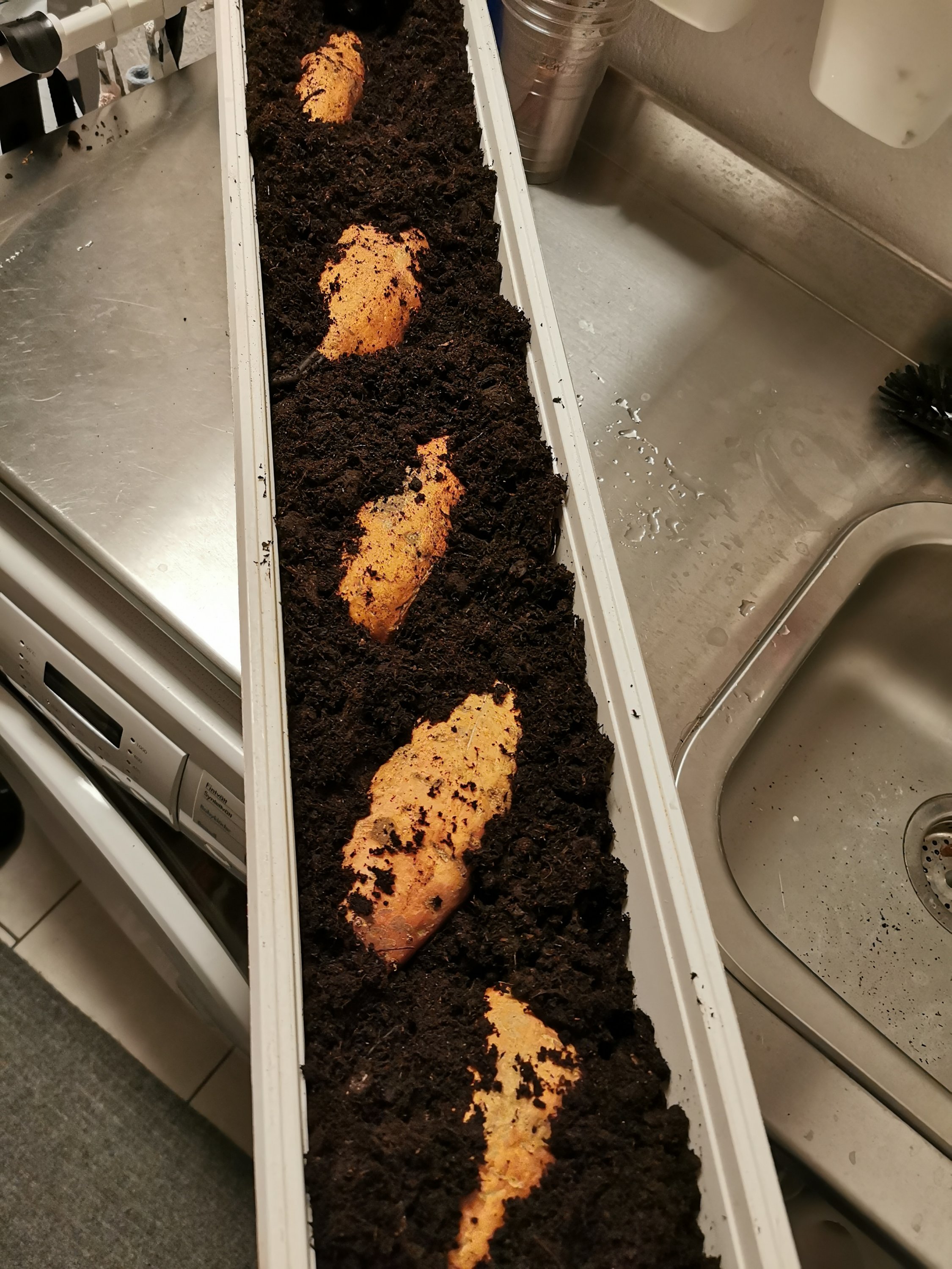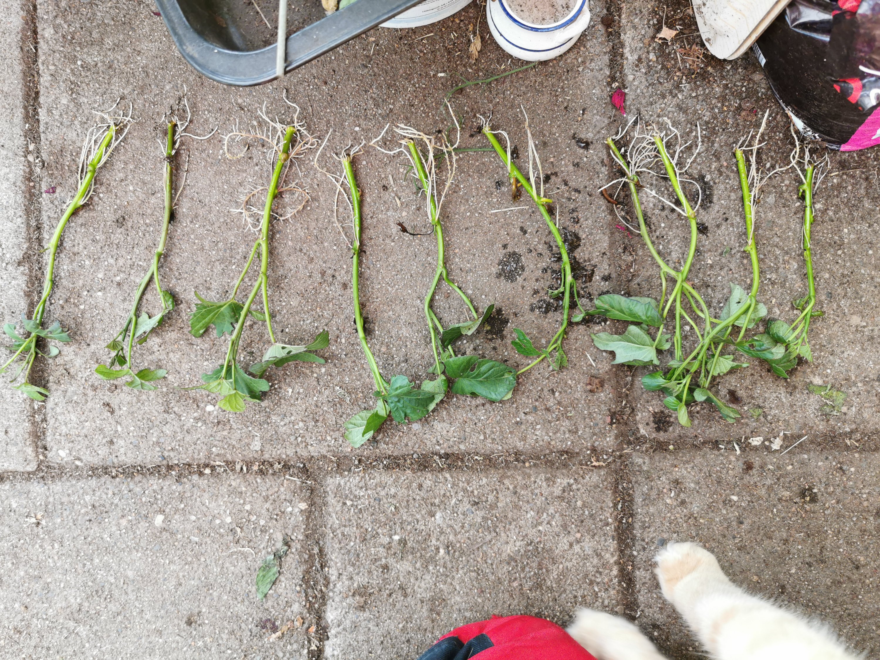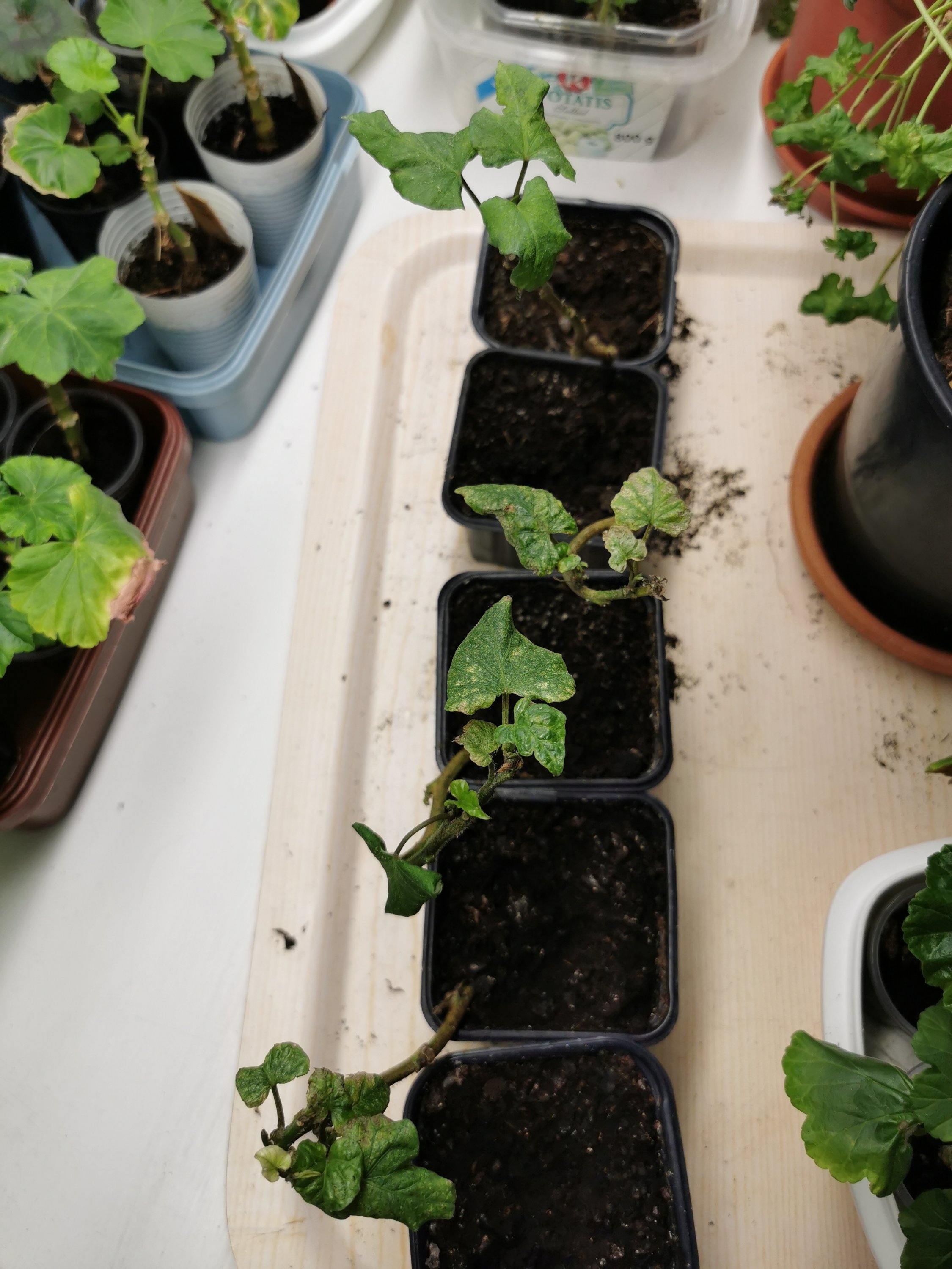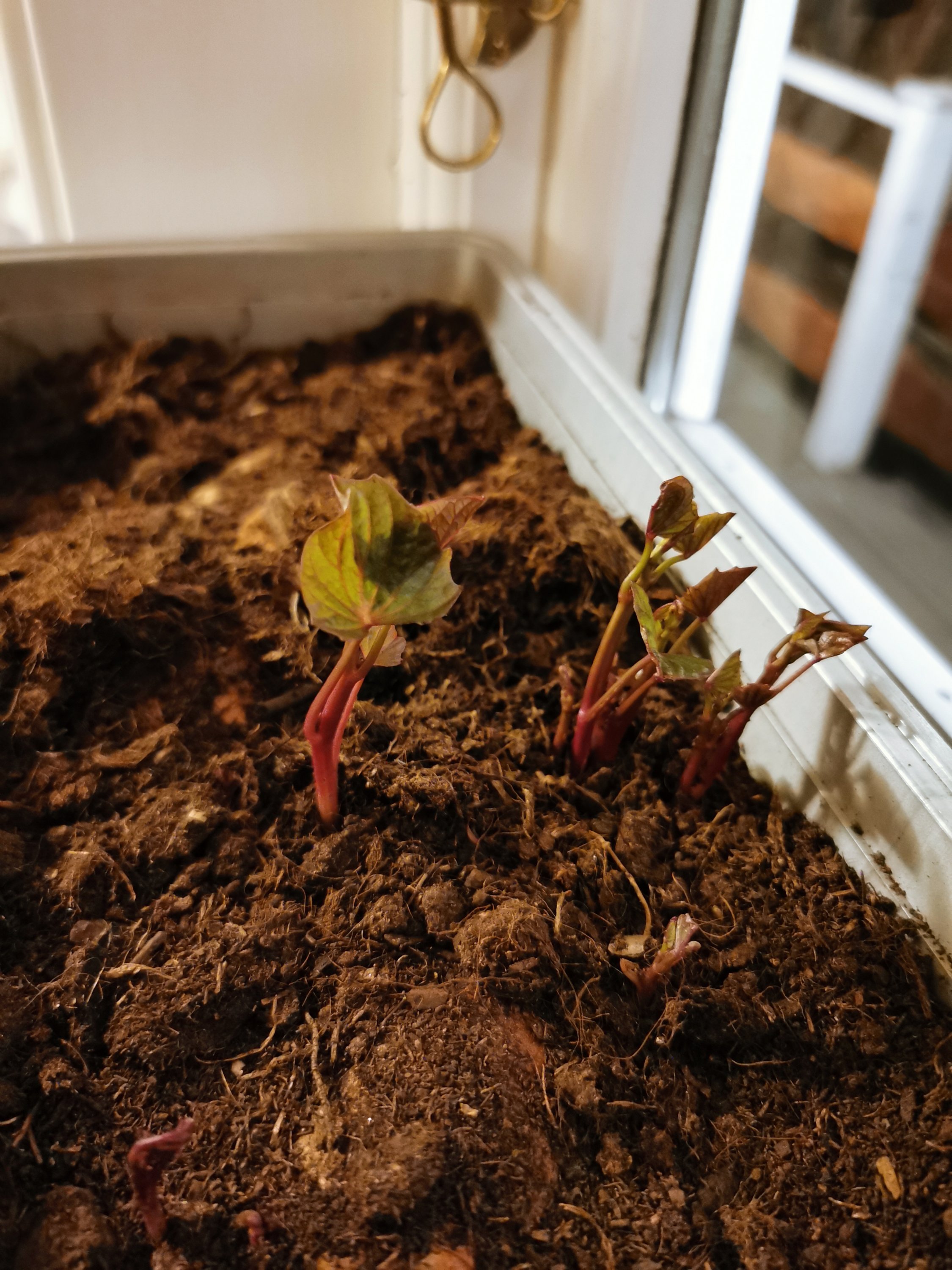 En tid innan skörd klippte jag av ett gäng skott, satte i vatten och fick snabbt rötter på dessa. De blev planterade och blev först väldigt fina men har nu under vintern trots växtbelysning blivit ganska skamfilade, löss och trips gillar dom dessvärre typ lika mycket som jag gör. Min förhoppning är att få dessa att överleva så pass att de kan användas som start för nästa års odling. Om inte annat har jag sparat några knölar av skörden för att börja om på nytt.