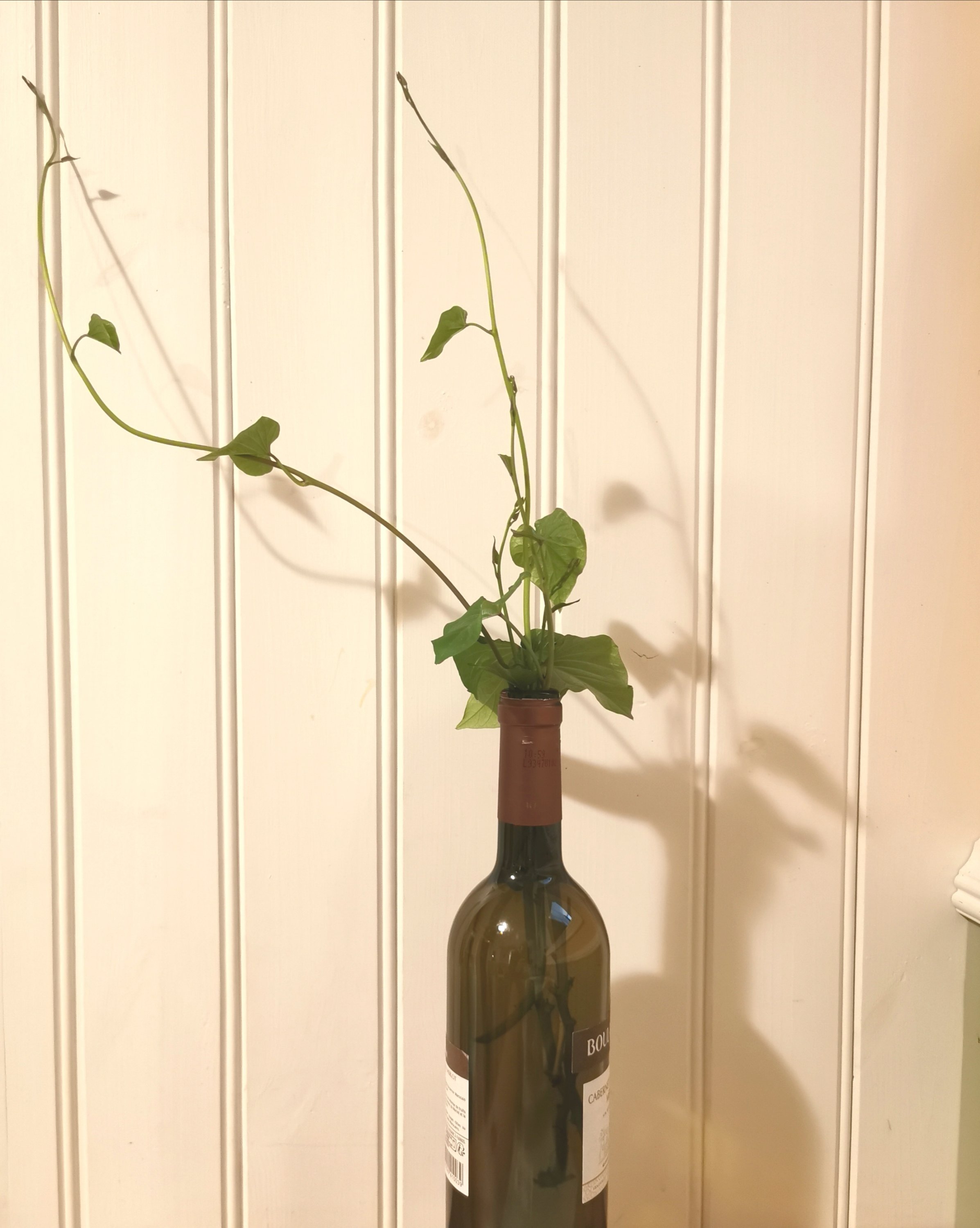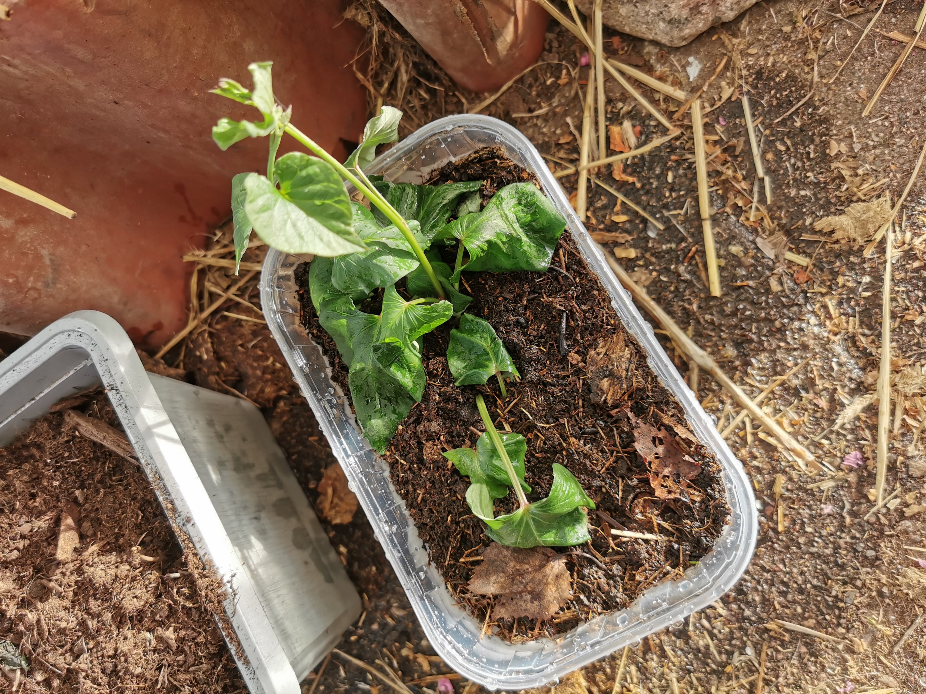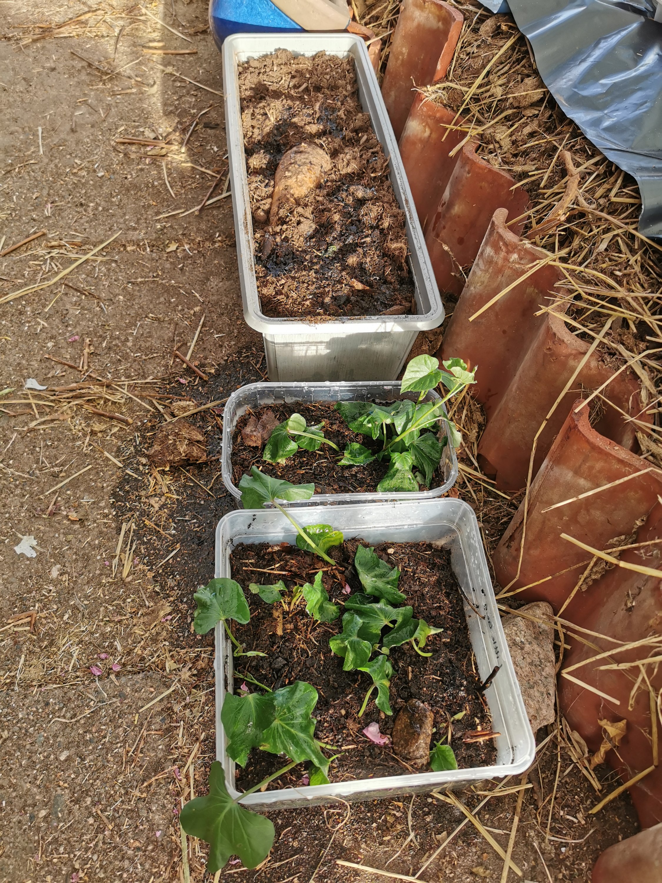 De fick en hel del vatten och växte något fantastiskt bra, täckte snart hela kragarna och började så smått klättra ut. De skott som var på väg ut ur kragen böjdes ner mot jorden. Det blev inga blommor men rackarns mycket vackra blad.