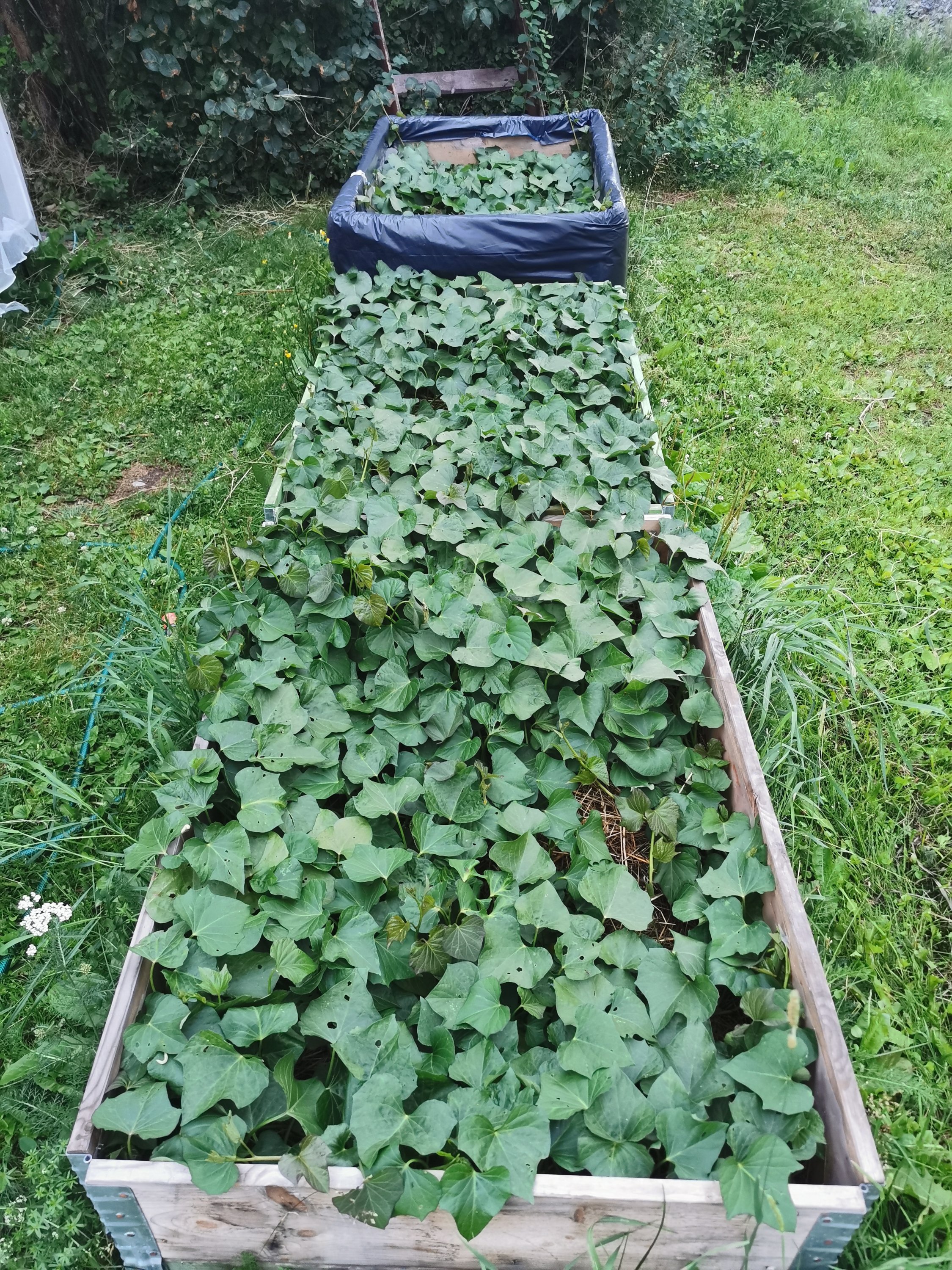 Okej, åter till mitt lilla växelbruk. Det går ut på att de flyttar efter varann och det tar fyra år innan de är tillbaka på samma ställe som sist. Där jag har ärtor och bönor ena året, följs av kål, majs och pumpa, därefter kommer lök och sist potatis. Efter det börjar det om från början igen. Typ. Och så har jag de grejerna som har lite special; morot. Den odlar jag i sand och till för ett år sen kämpade jag på med att flytta runt denna låda för att som jag trodde lura morotsflugan. Vid lite djupare studier visar det sig att morotsflugan inte kan komma ner till moroten om man täcker med gräsklipp vilket också förklarar hur mina morötter har klarat sig utan minsta angrepp. Och jag kommer nu ALDRIG mer att kånka iväg lådan till andra sidan landet, utan glatt bara göra en fåra i sanden, sätta frön, vänta på deras uppkomst och sen täcka med gräsklipp mellan raderna 😃