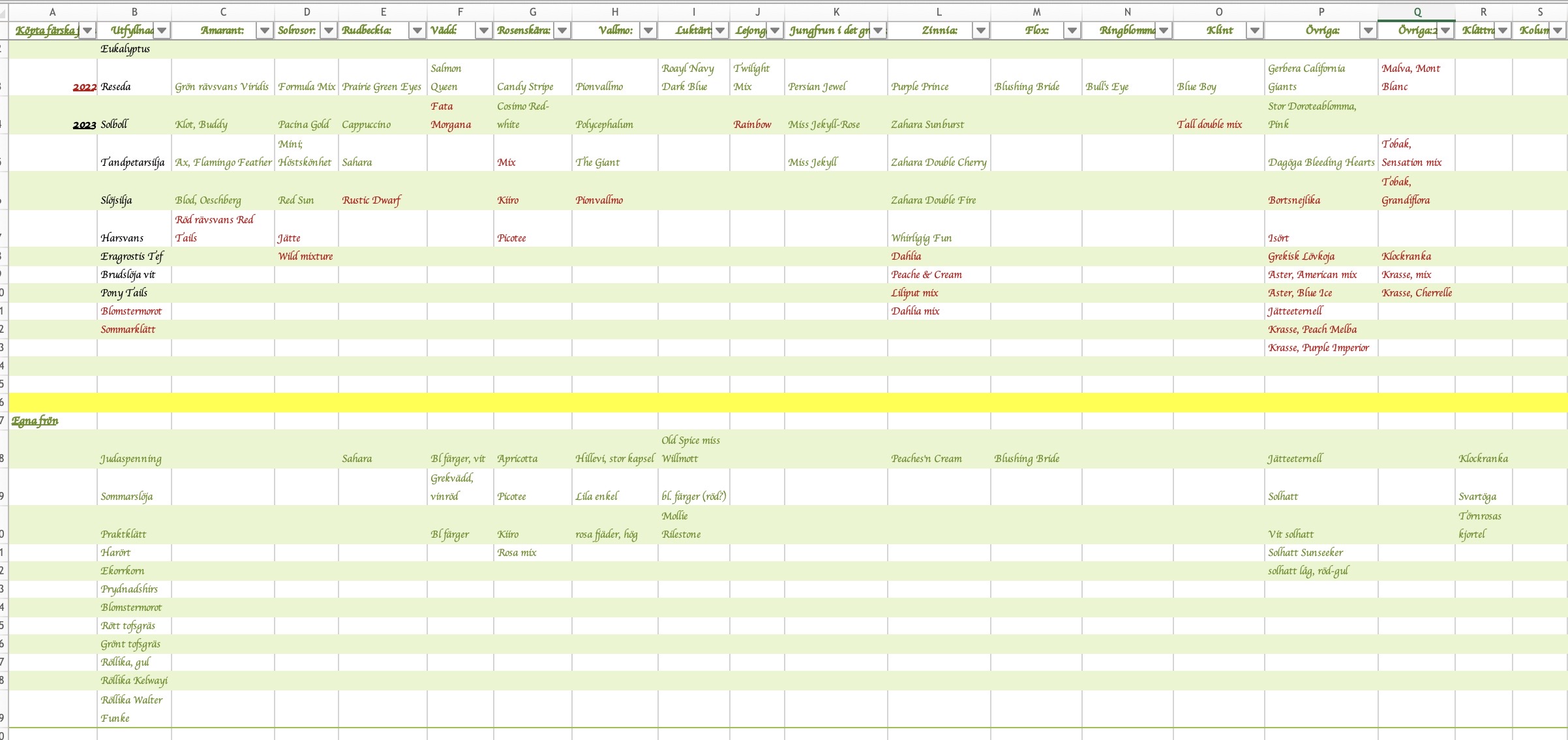 - Egna frön: grodde bäst och ger massor av fina blandade färger, bland annat den gräddvita, så fin som övergångar mellan vit och andra färger. Den mjukar upp intrycket i en bukett. Tror att dessa är från fjolårets mix.
