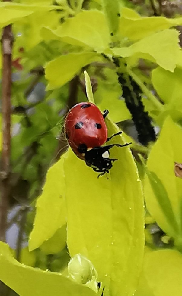 Idag hade vi välkomna gäster vid guldscheraminen: såg två 7-prickiga nyckelpigor. Blev så glad för jag såg inte till en enda förra året.