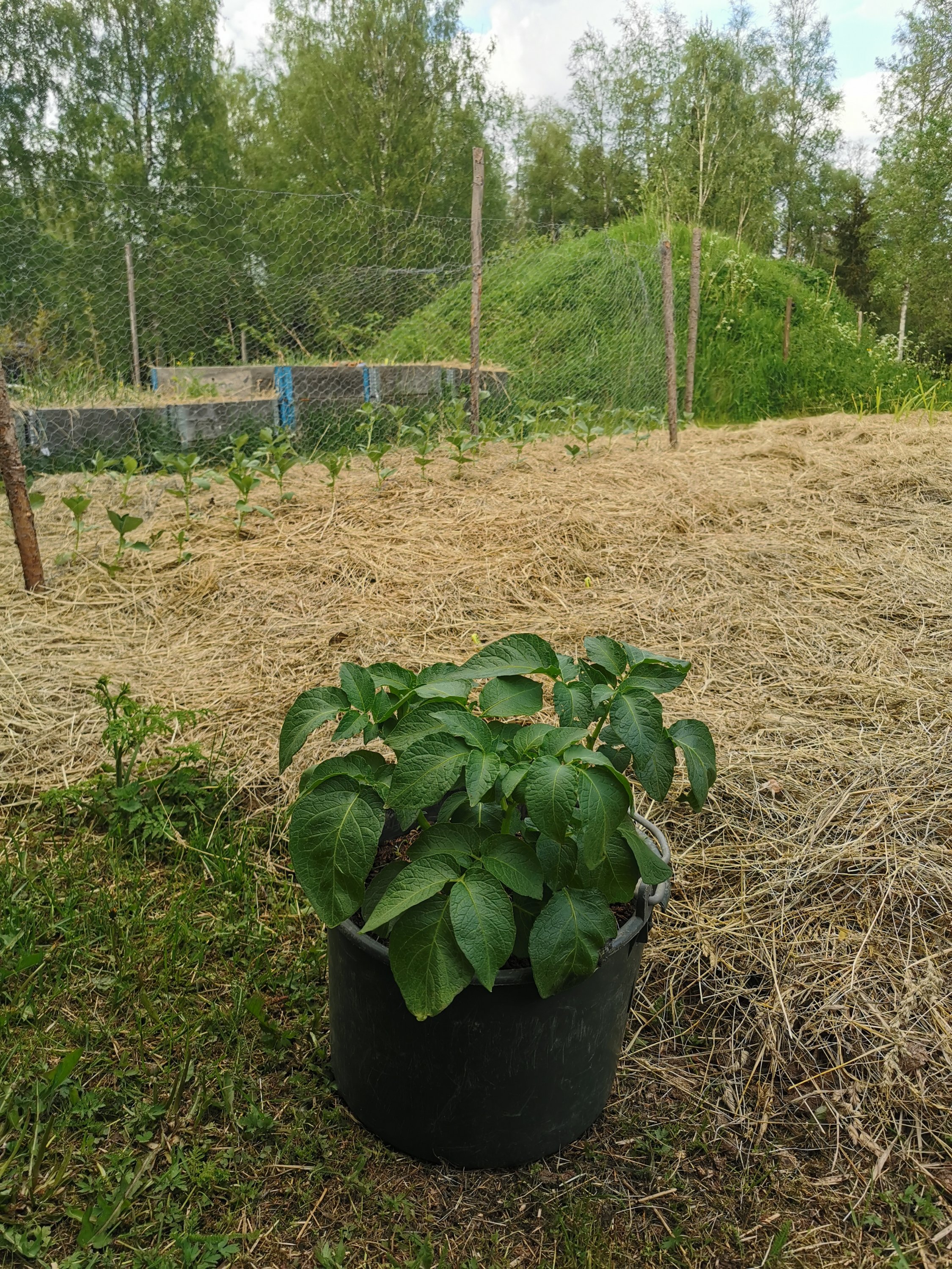 Potatisen som fanns kvar av förra årets skörd blev utsäde, de har stått i sadelkammaren och förgrott sig själv. Ganska skrynkliga och med långa groddar fick de komma till årets nyetablering av lanne. Hästskit i botten, ut med knölarna och täcka med hösilage. Det fanns lite mer utsäde än vad som fanns plats för så utbyggnad av lanne kommer bli aktuellt. I år ska jag också testa ett par nya sorter; Sarpo Mira och Pocahontas. Båda är sena sorter tvärtemot mina gamla som nog mestadels är tidiga; Amandine, Swift, Bourdaux och röd med vitt kött som jag inte minns namnet på. Jag förväntar mig inte att få nån tidig skörd, det är jag alltför sen med sättningen för att ens kunna fantisera om, men jag har en hink potatis som ser lovande ut.