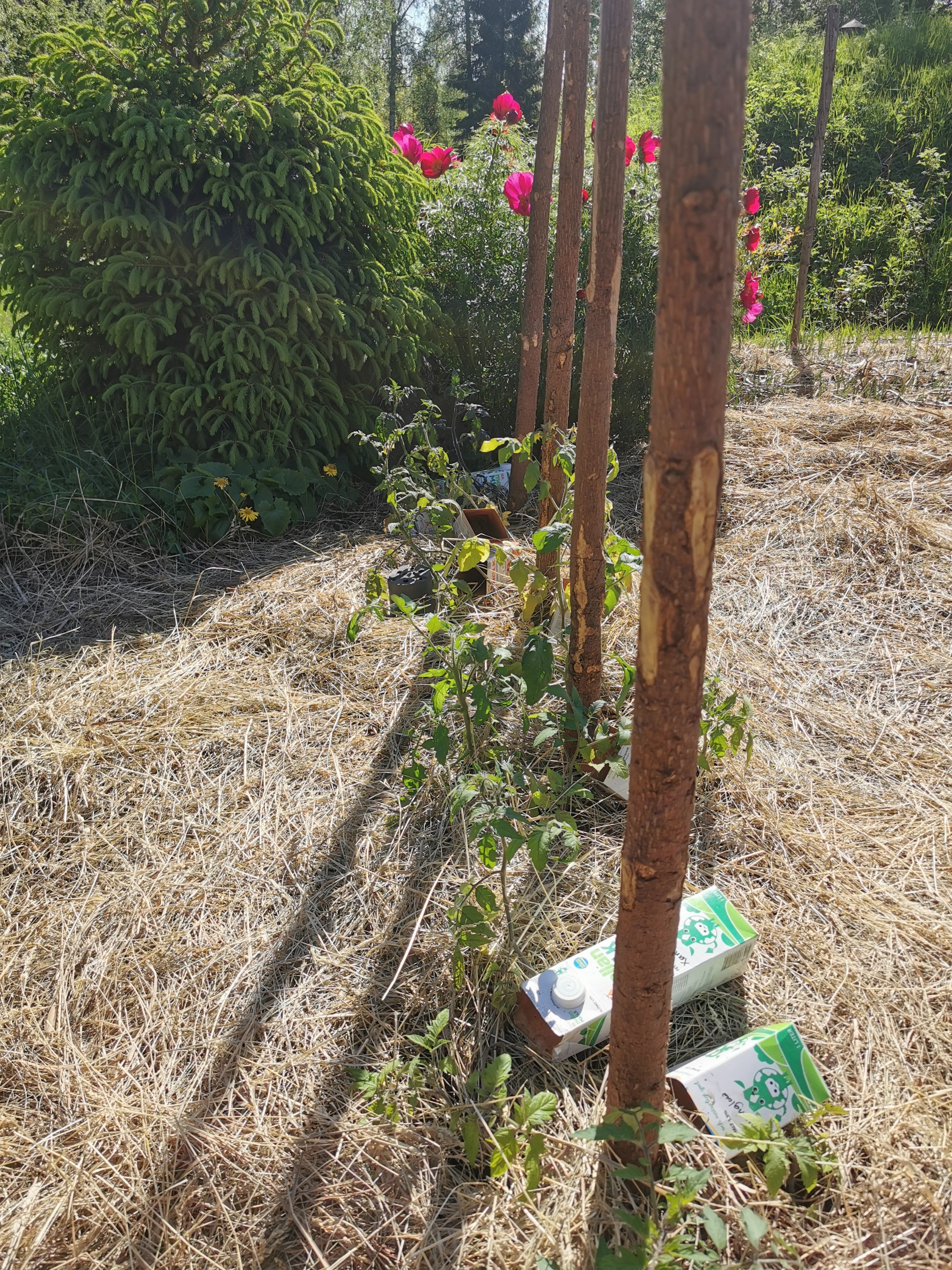 Tråkigt nog råkade jag också få kristallsjuka i samma veva som jag höll på med det sista av plantera det. Ny upplevelse. Inte särskilt angenäm och särskilt dålig tajming – det är ff asmycket att göra i trädgården och jobbet är inne i sin absolut intensivaste period. Åka karusell är ju trevligt en liten stund men att få den med sig när man går och lägger sig är INTE roligt. Läkaren talade med lugn röst om att det brukar försvinna på ett par veckor. Ett par veckor! Nu när allt skulle bli klart och det inom rimlig tid är dags att börja njuta av sommar och ledighet. Övningarna som jag fick går ut på att dra igång värre yrselattacker och på nåt vis ’lära’ kroppen vart balansen finns alternativt kasta rätt kristallvätskan i örona. Märkligt. Så mellan övningarna får man käka åksjuketuggummi och tänka på hur man går för att inte drutta ikull. Så här ca en vecka senare går det bättre. Jag har ’lärt mig’ att vänta lite efter att jag har rört huvudet så att yrseln avtar, och så är jag ju såklart bättre även om det rackarns inte är roligt. Man törs vare sig köra bil eller rida. Cykla är inte att tänka på. Trist. Man får pula på så sakteliga med plantering och sådder. Och familjen får hjälpa till. Klätterstöd för ärtor, tomater och bönor var mannen bra på. ’Vill ju inte ha dig vinglandes på en stege med en stolpnedslagare över huvet’. 😄 Eftersom det var väldigt fint väder (varmt, strålande sol och klarblå himmel) fick både bönor och tomater en fiberduk för att skugga så att de inte skulle få solsting.