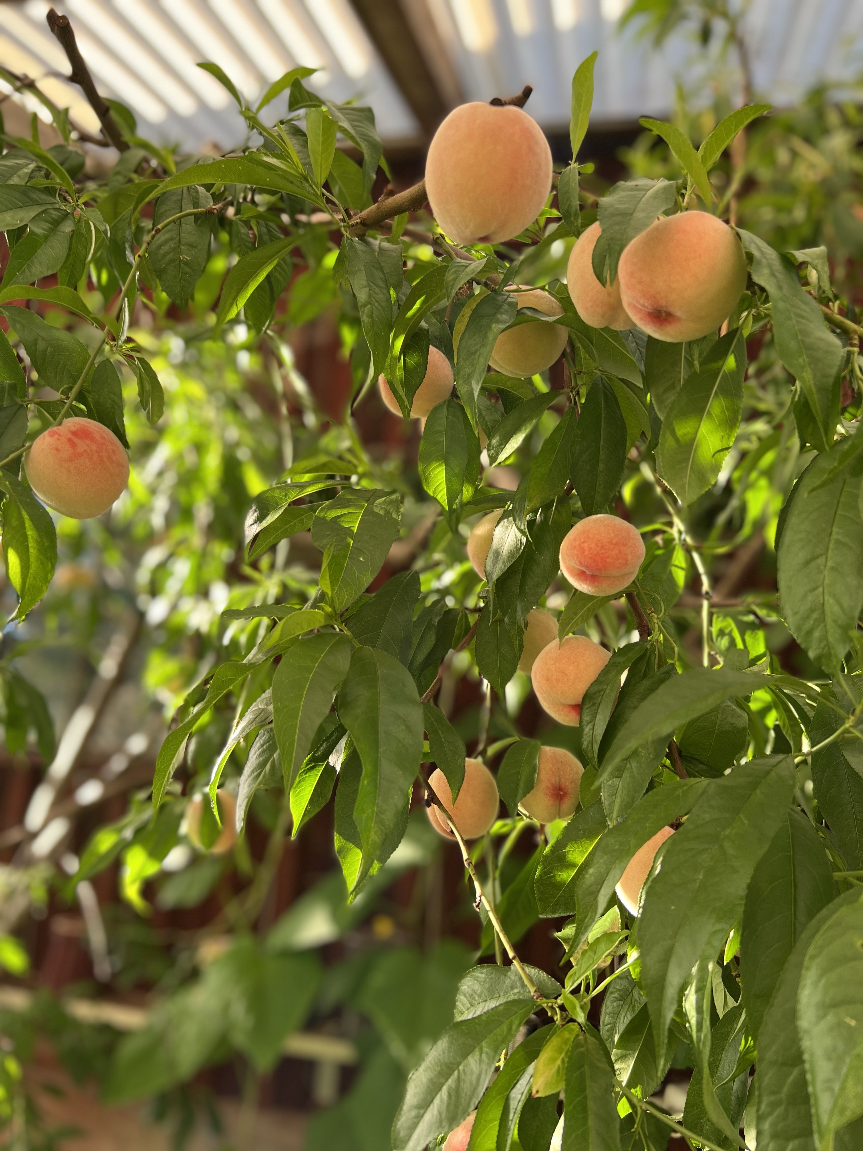 Problemet med persikan kan vara löst, ev helt och hållet och för alltid 🙃. Jag har beskurit det superhårt. Kapat ner flera stora toppstammar. De grenar som är kvar är också inkapade en hel del, men jag tror ändå att det ska kunna gå. Jag har sparat några mindre grenar som ser ut att kunna bli grunden till nytillväxt och hoppas att kunna forma om trädet så att det inte alldeles tar över växthuset. Gissar att nästa sommars skörd går förlorad men det får isåfall bli så. Visst är det fantastiskt att odla och få rejäl skörd av persikor, men det måste växa fler saker därinne. Och mitt nästa persikoträd kommer att få bo utomhus.