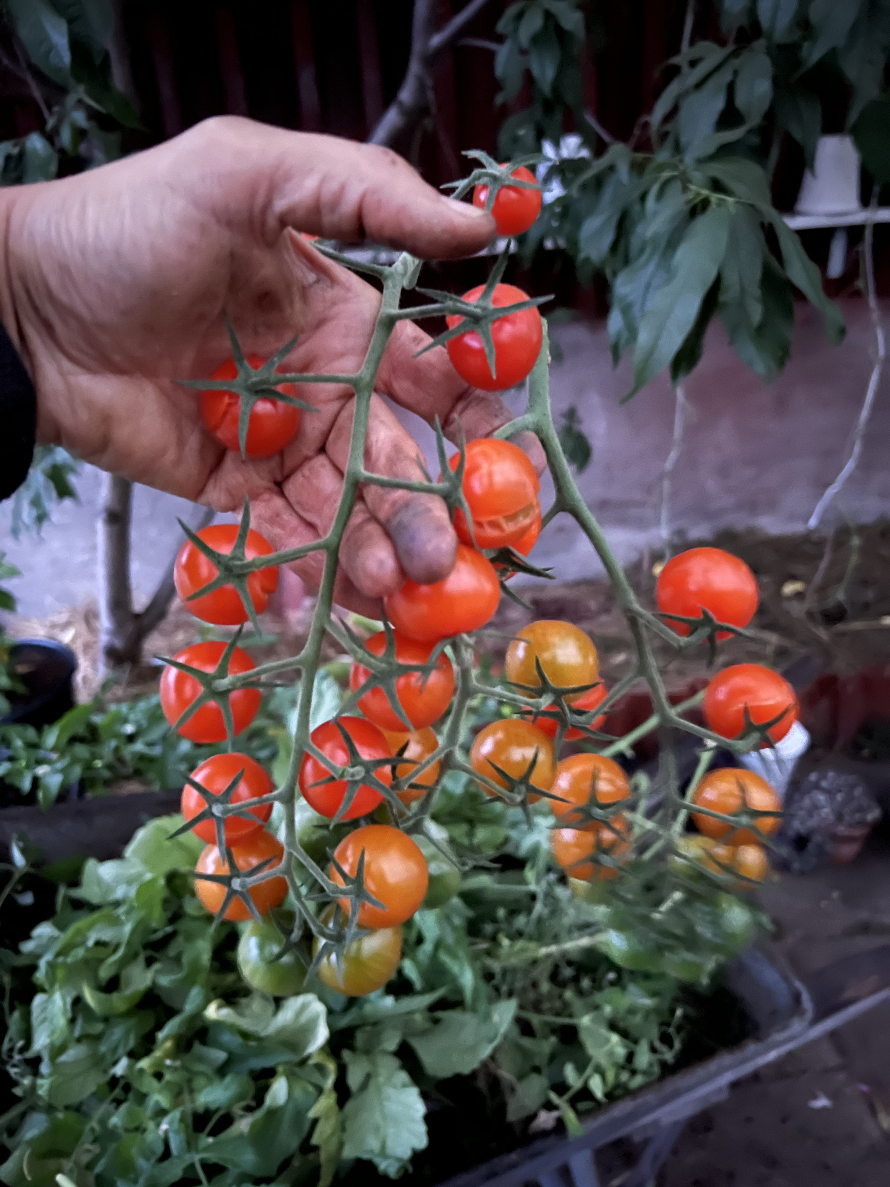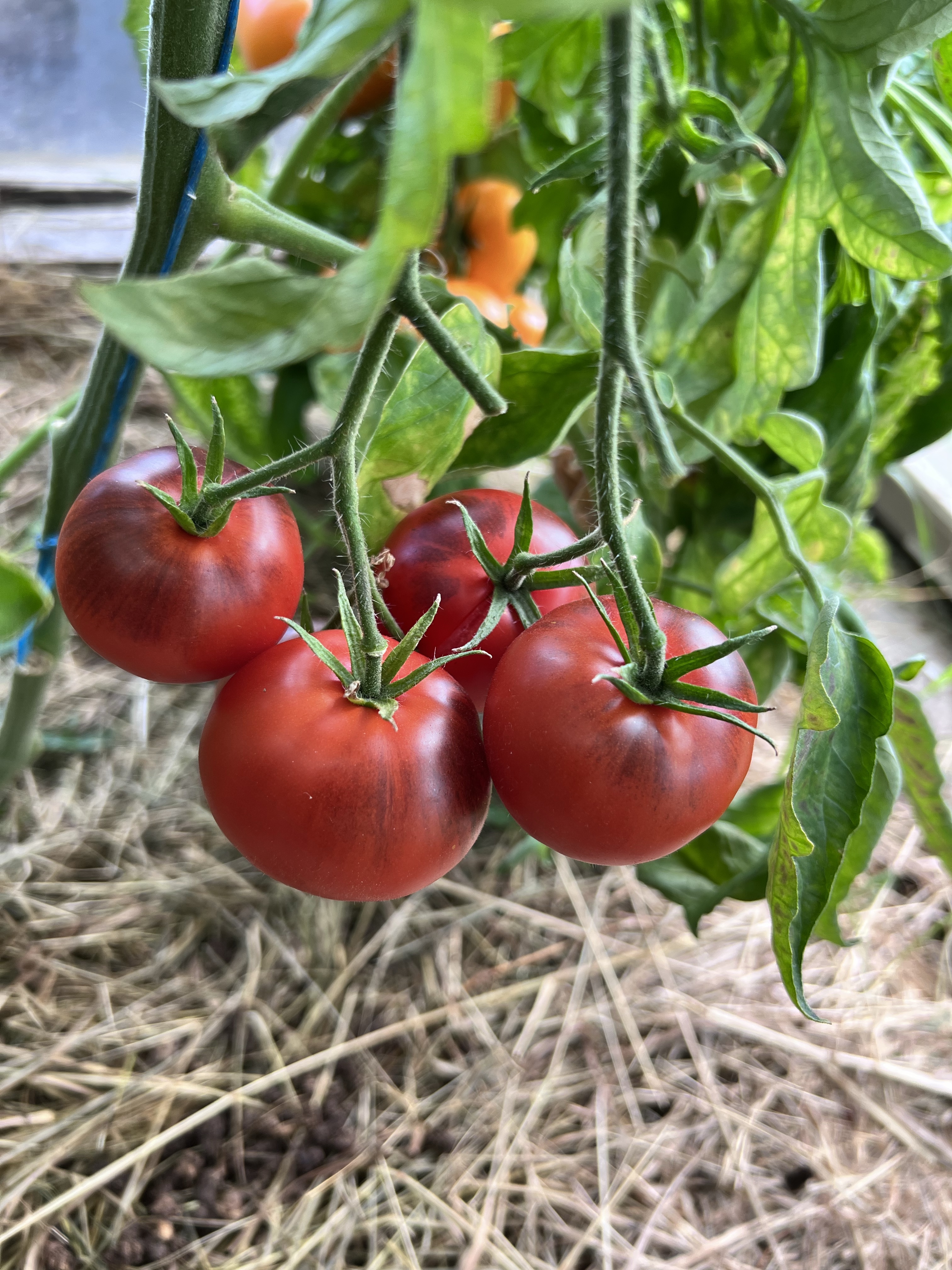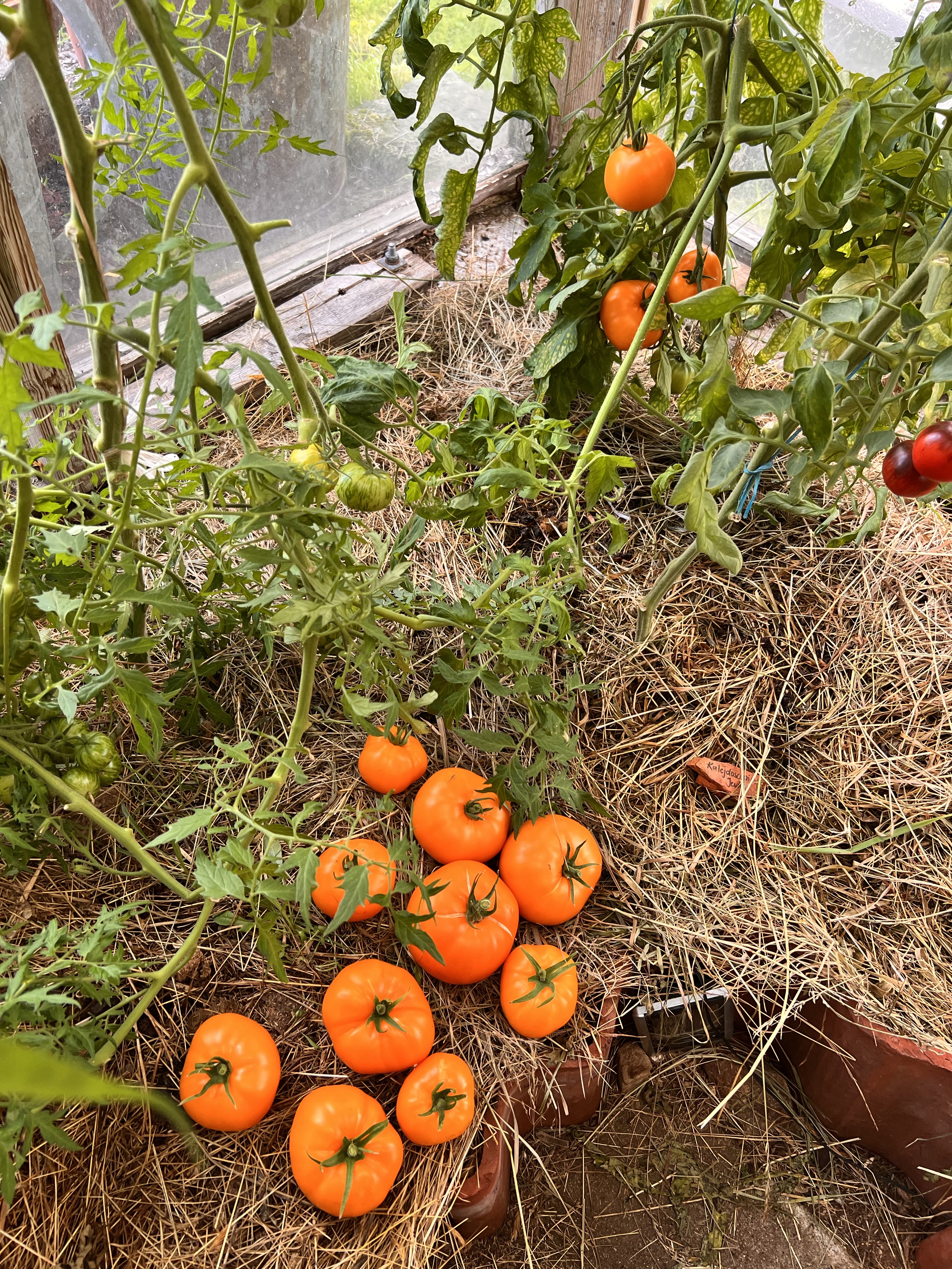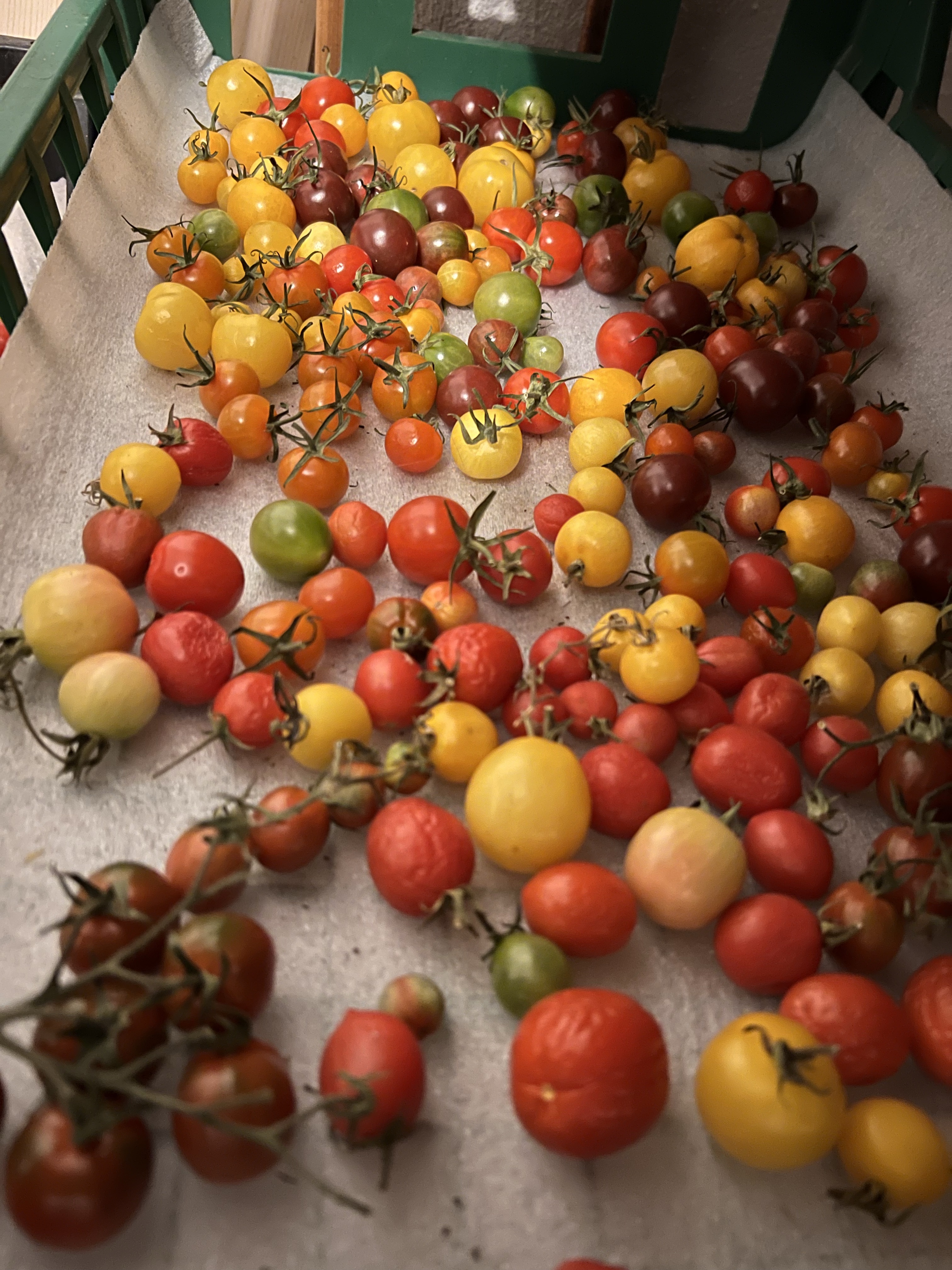 Av årets nyheter; Anmore Dewdrops, Grinch dwarf cherry, Black Opal, Sibirjak, Linda, Loxton Lass Dwarf, Alice’s Dream, Orange Crimea och Bombeta. Av dessa så har busktomaterna Sibirjak och Linda gått upp på favoritlistan. Båda är röda busktomater, Linda lite mindre och lite plommonformad. Båda odlades ute med bra resultat. Mycket god smak och bra hållbarhet. Keepers. Alice’s Dream, Orange Crimea och Bombeta blir kvar, Alice är jag inte lika överförtjust i som alla andra verkar vara men den är väldigt snygg håller jag med om. Grinchen var helt okej och kanske var den lite mer produktiv än Green Envy som jag alltid måste ha, den är såå god. Finns ingen som når upp till samma nivå tror jag. Orange Crimea gav fantastiska klasar med stora tomater, 1kg på en gren liksom! Trots att tomatplantorna var fina och växte bra så blev det sen skörd. Utetomaterna var snabbare, men så var det ju också en uppdelning med att ampel- och buskisar fick sitta ute och det är ju de som alltid är snabbast. Whippersnapper var först ut 28/6. Inne kom Sungold först över mållinjen/läpparna, 23/7. Biffarna var särskilt sena och Black Beauty som varit en sån mastodont i produktion fick se sig slagen av Ilses Orange Latvian. Sista slutskörden ute gjordes 4/10 fast då hade jag plockat bort tomater och plantor lite pö om pö för att vissa plantor stod mer utsatt för kyla än andra. Det kom några kyliga nätter i mitten av september där vi precis klarade oss från frost och sen höll det sig på plussidan fram till 9/10. Tomaterna i växthuset togs in 21/10.