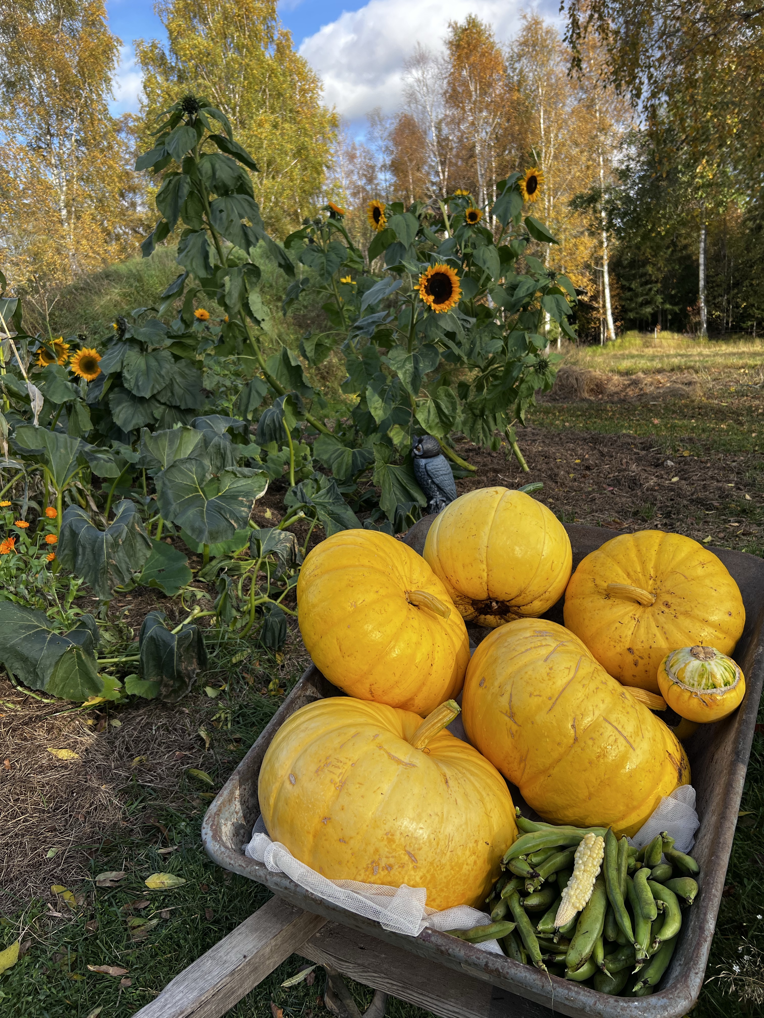 De olika kålsorterna (palm-, grön-, lila- och savoy) som skyddats av ringblommor och nät har räckt till för oss, kanske har det blivit 2-3kg. Intentionen att sätta upp skydd mot rådjuren har inte blivit av, jag är inte tillräckligt hungrig och jag plockar av den så länge det finns något kvar ändå. Gurkan är en annan av årets om inte misslyckanden så i alla fall besvikelser. Jag fattar inte varför de ska vara så kinkiga. Växer på som attan för att sen som i ett trollslag inte vilja vara med alls. Efter att de kastat sig för mina fötter och grinat när de skulle få flytta ut i växthuset repade de tills sist mod till sig och sa väl lite ”okej, tack då” för att jag preppat en bädd med rejält med bokashi (typ allt jag hade). Men det blev aldrig nån gurkfrossa även om vi väl inte behövde köpa några.
