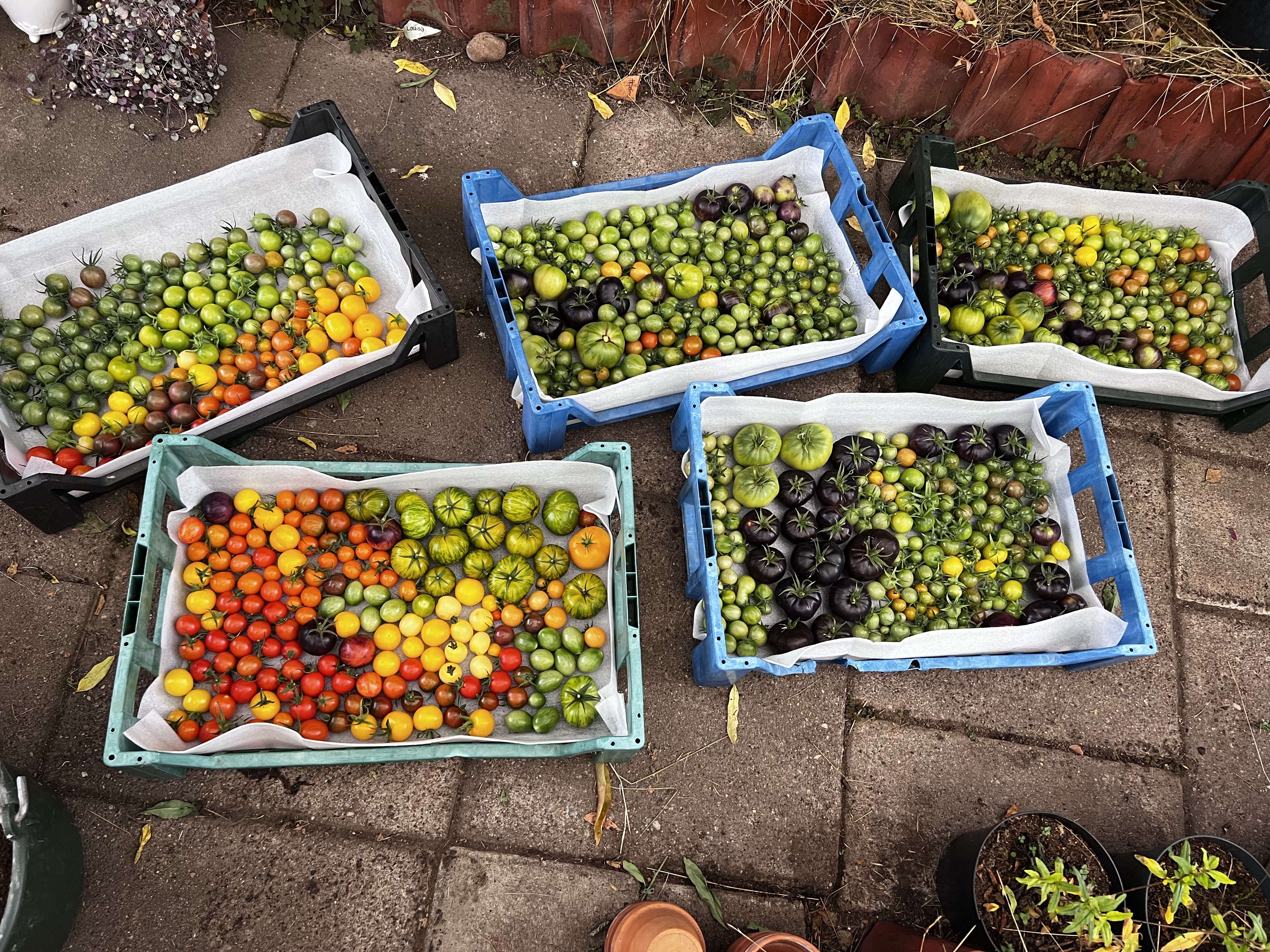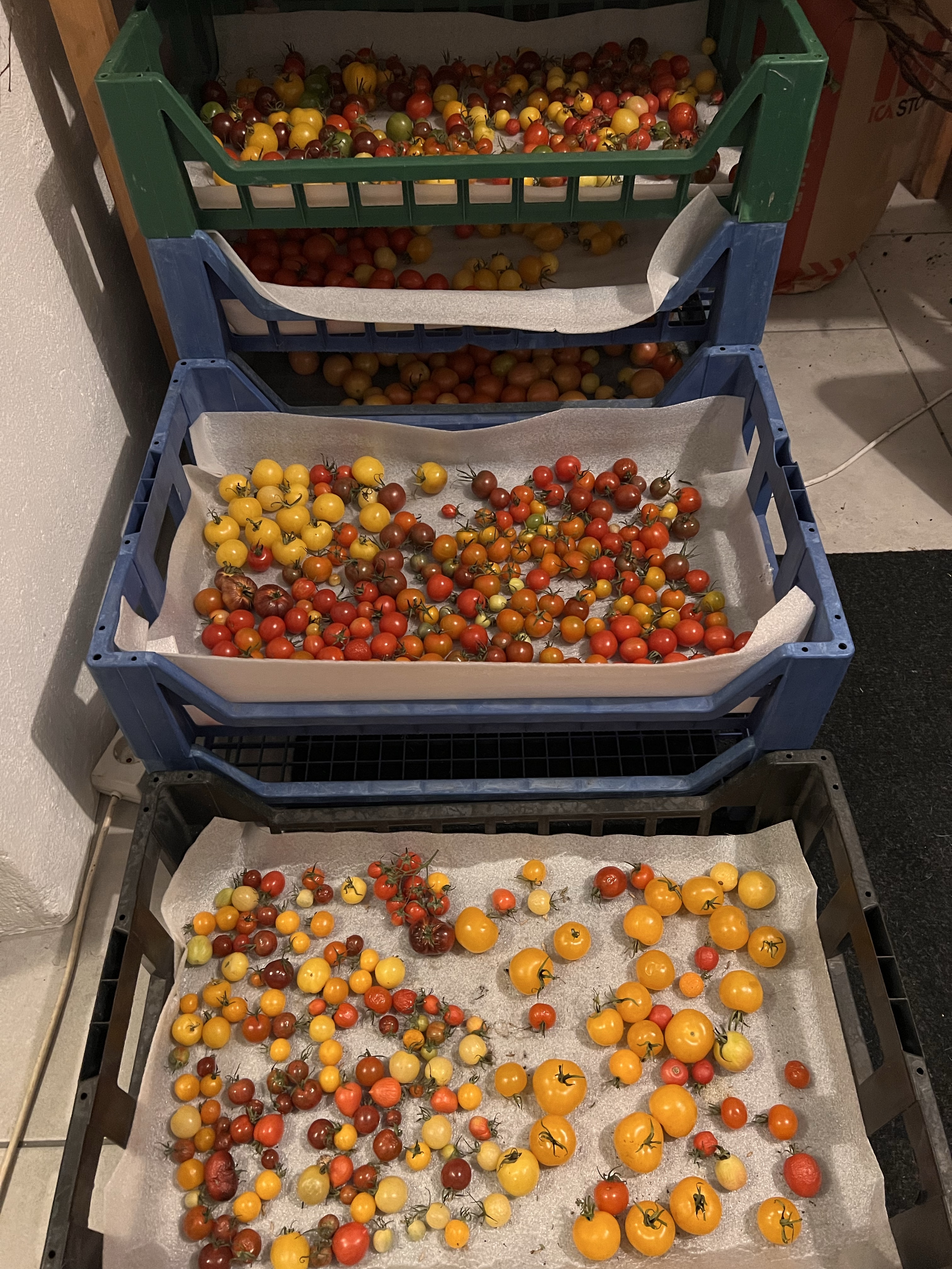 Tillbaka till Tomaterna – det blev totalt 90kg! Och jag som tänkte att det nog inte blir lika mycket som förra året – jag hade färre plantor i år och det var otroligt trögt innan de kom igång. Med lite uppskattning av mängderna tror jag att årets ätbara skörd totalt landat på ca 320kg (alla ätbara grönsaker). Är det möjligt att vi två pers stoppar i oss allt det? Vet inte. Vi får se när sommaren är här. Kanske måste jag inte odla så mycket nästa säsong. Sa hon och bläddrade girigt bland fröpåsar och surfade på fröfirmornas lovande utbud 😜