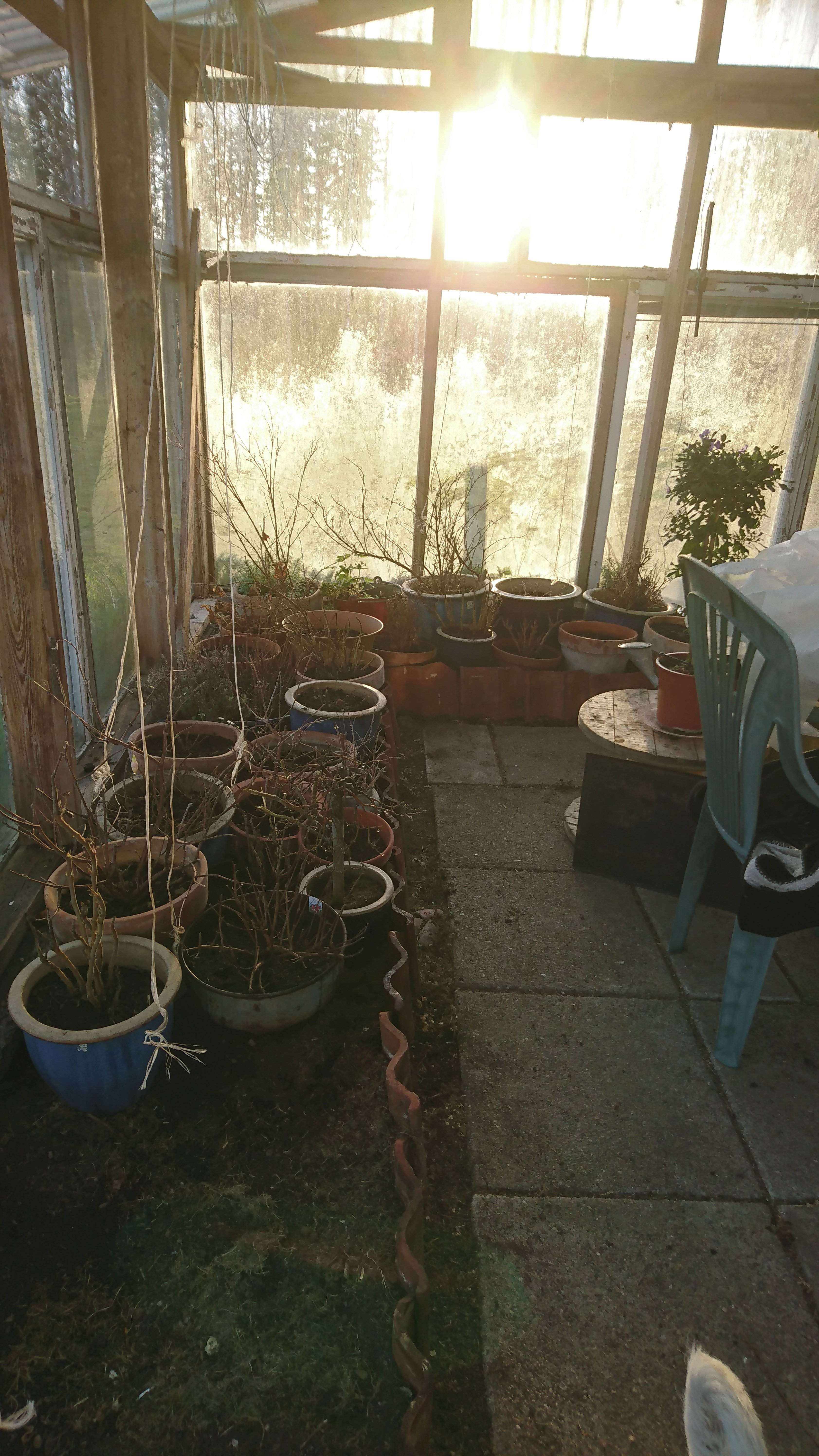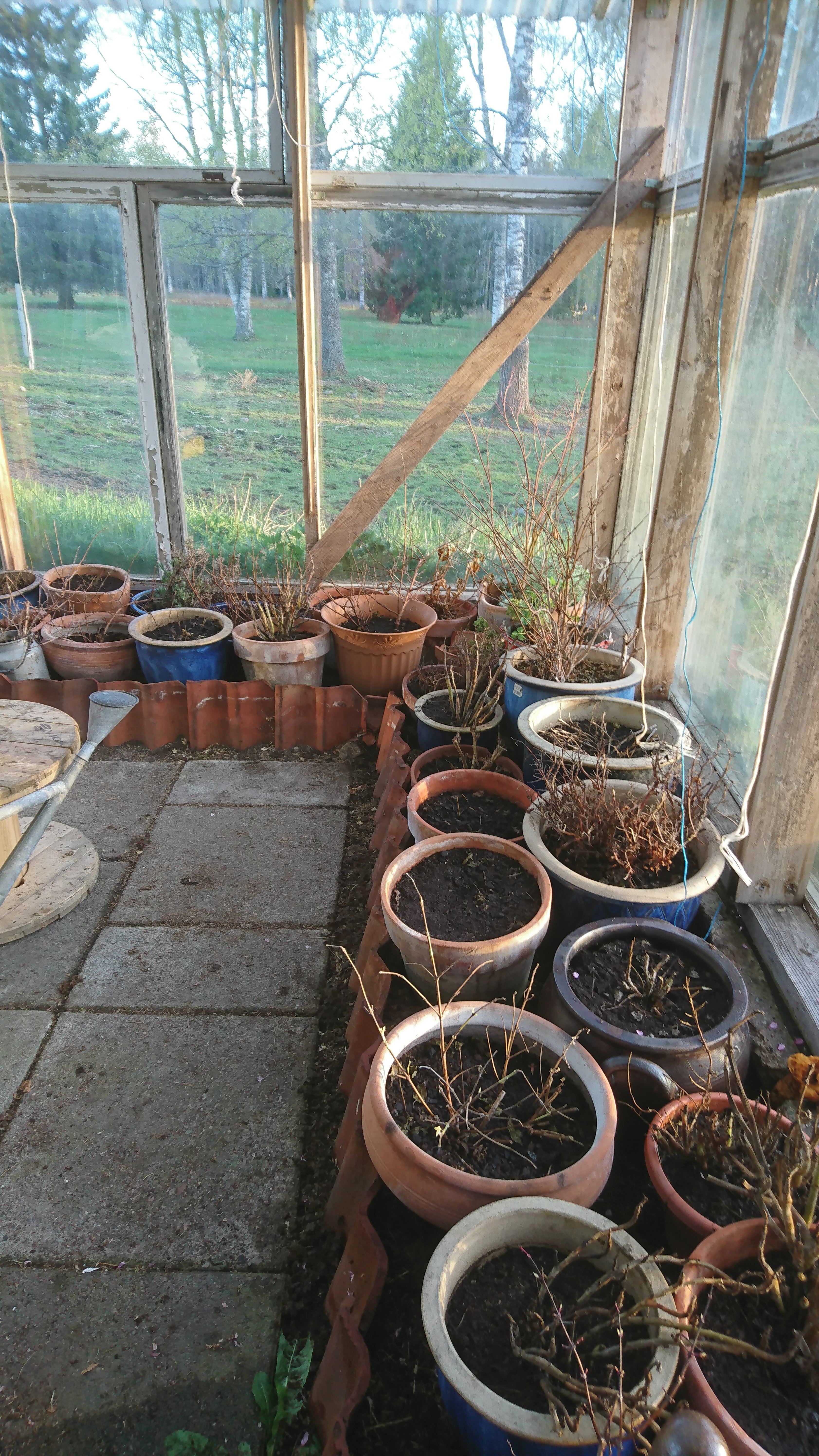Igår togs krukorna från jordkällaren in i växthuset. Jag vet att det är i senaste laget, men jag hade lite glömt bort dom.