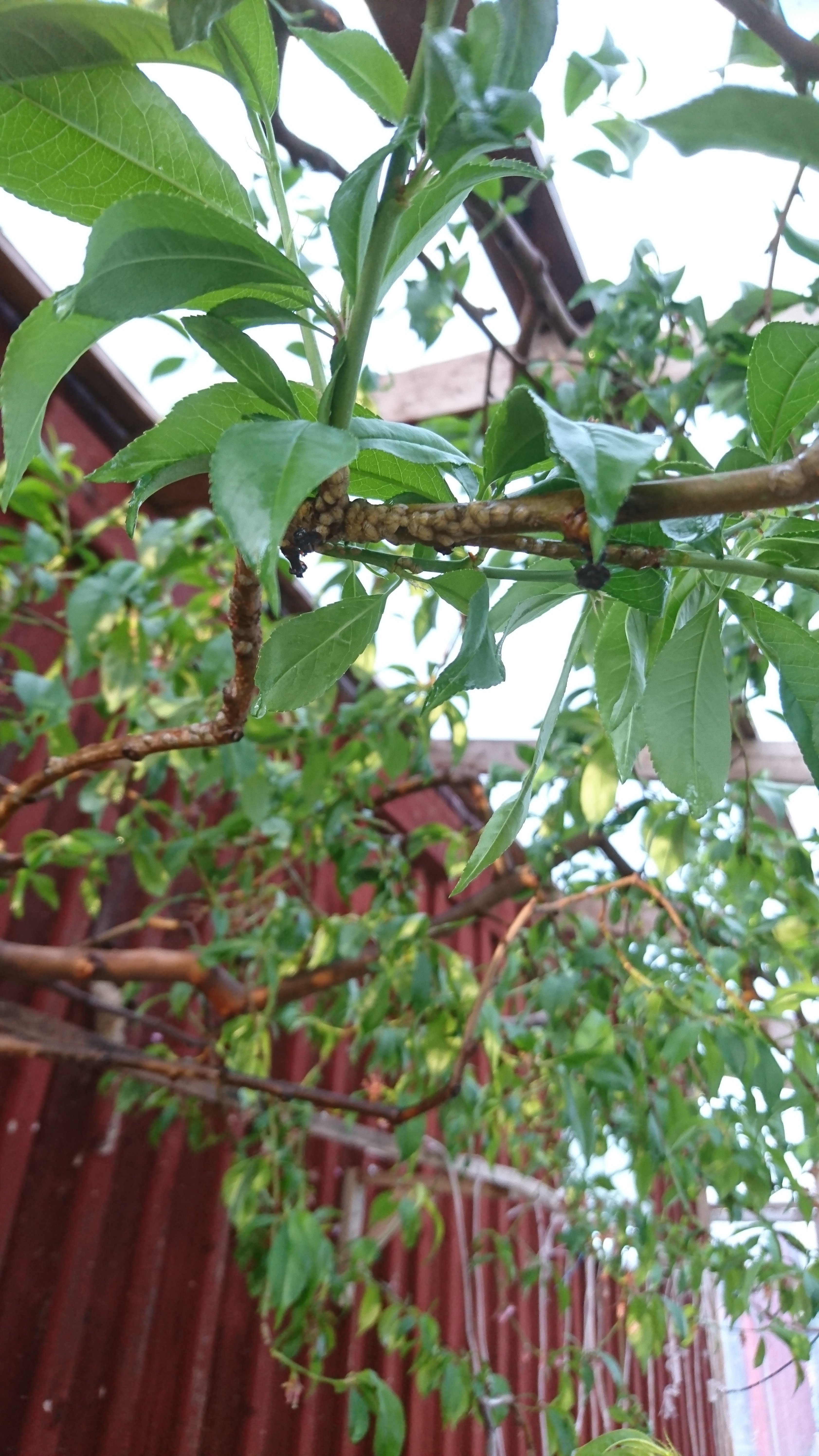 Persikor innan mogningNågra av de vi fick iår, totalt blev det kanske 30-35st.Tillväxt uppe vid taket med tydliga angrepp av spinn. Detta får sitta kvar och utstå duschar varje dag med förhoppning om att kvalstren mattas av och det nya som växer ut klarar sig bättre. Nyklippt träd