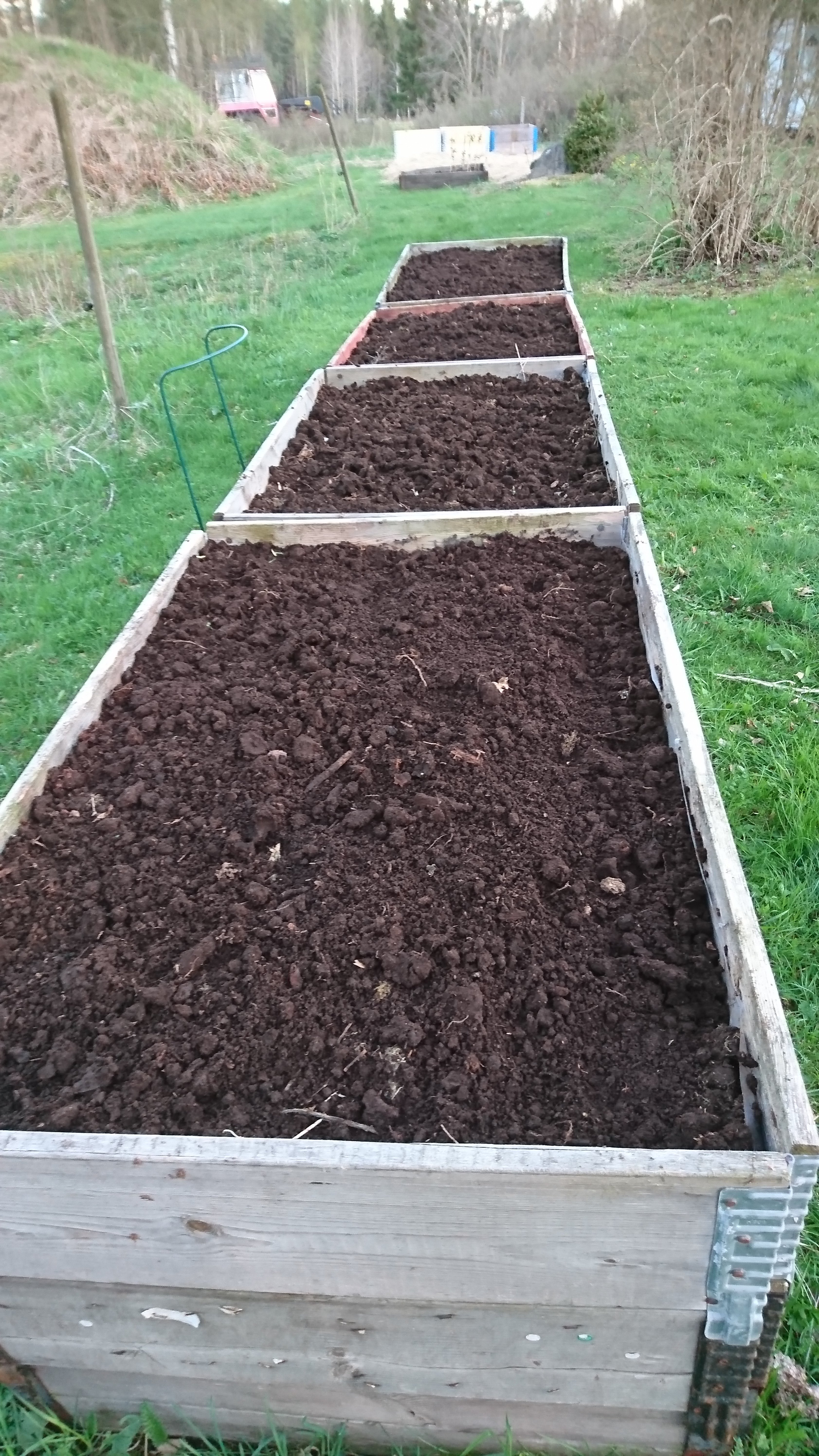Och så blev det påfyllning av jord i pallkragarna, jorden är tagen från det som grävts bort från skogen där det ska bli väg. Den är så svart och mullig, tror att det är lerjord. Hoppas jag. Så att det inte är nån jävel som dumpat olja i skogen och det är det jag odlar biodynamiskt i..