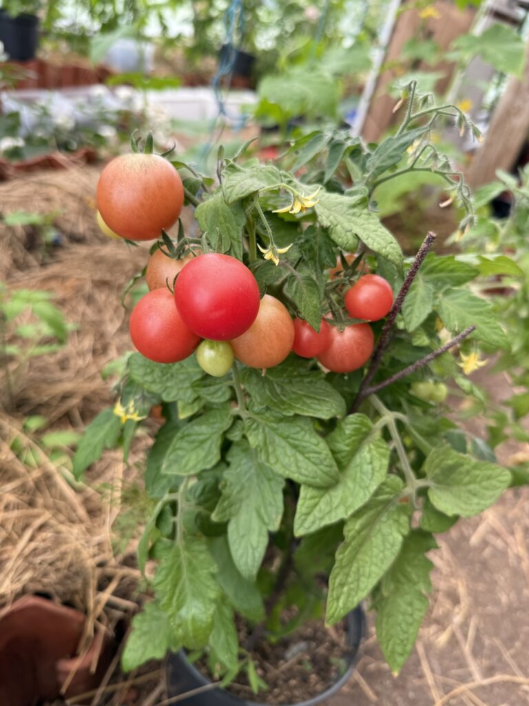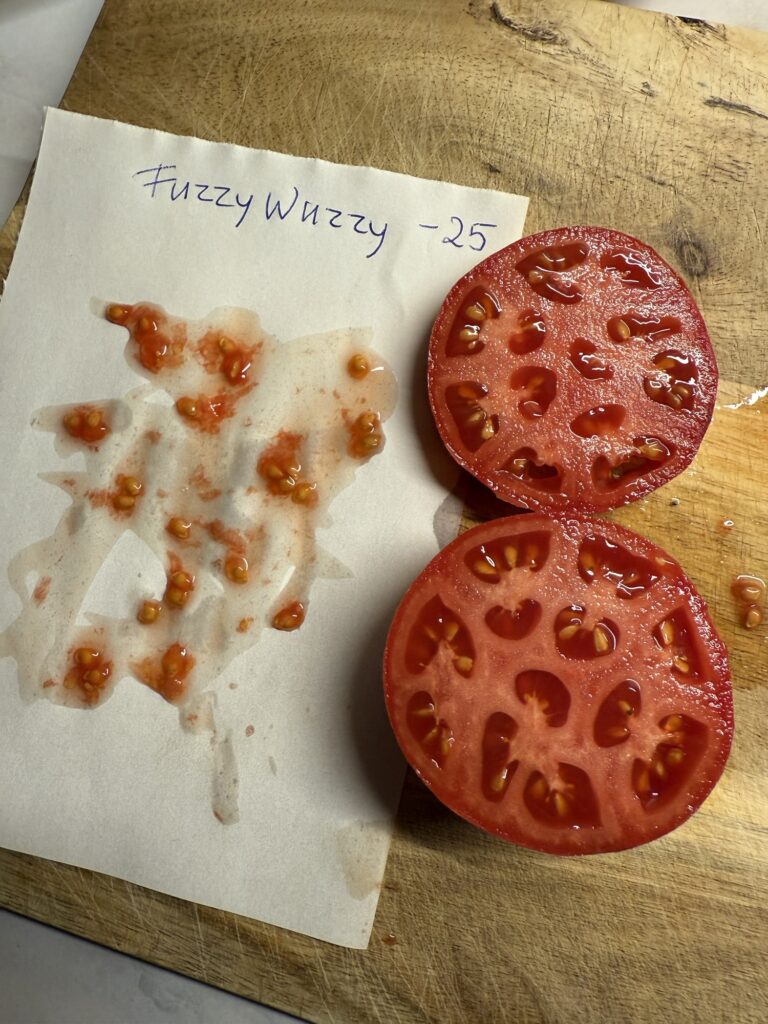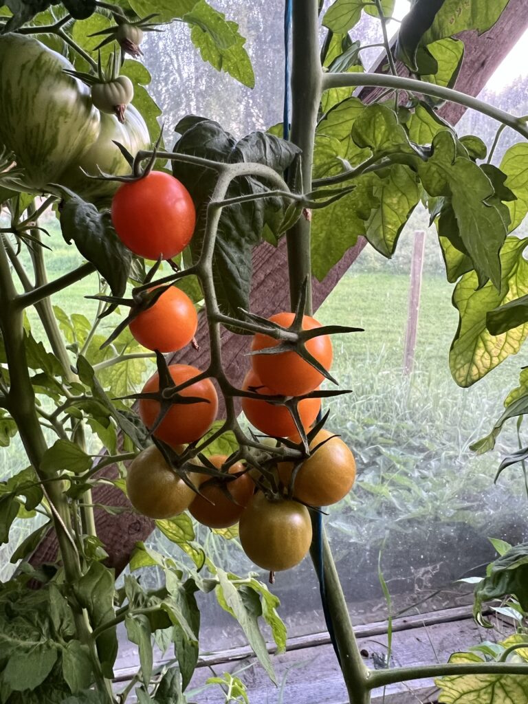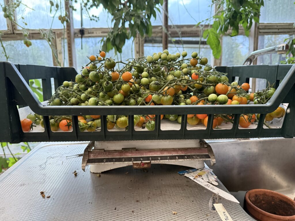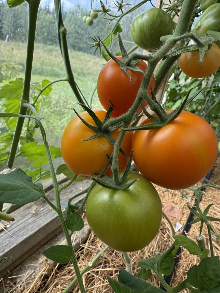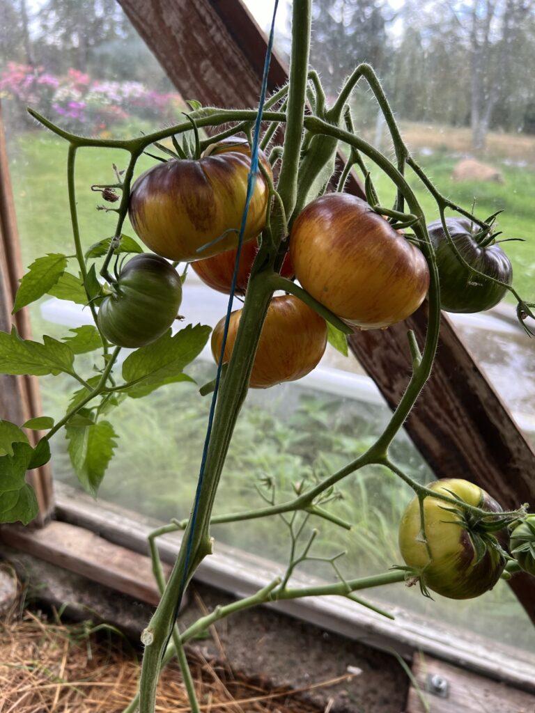 2024 fick jag fram plantor som härstammar från ett par olika f1 sorter. Den ena som jag ska odla vidare på är v.svart.plommon; en plommonformad körsbärssort med svartaxlade frukter som slår över till röd vid mognad. Så otroligt vackra och goda vid normal mognad – men som en sensation när de börjar skrumpna i skalet! Söt och fyllig smak. Den andra som jag också ska försöka få stabil är en liten orange plommonformad; Regnbågen är arbetsnamnet på den. Även den otroligt fin och namnet kommer av hur frukterna ser ut som ett pärlband som sömlöst går från grönt till orange. Även smaken är annorlunda, söt visst, men också rund och fyllig utan att kännas det minsta skarp eller vass. Någon jag verkligen behöver då blåsor i munnen är ett konstant tillstånd under tomatskördstiden. Den svarta blir godare ju mer den lagras, även den mild och rund utan syra, samma som regnbågen en annorlunda övergång mellan skal och kött som knappast känns alla. Den svarta tycker jag har en ton av plommon..? Svårt det där med att beskriva smak, en är ju ingen sommelier direkt..
