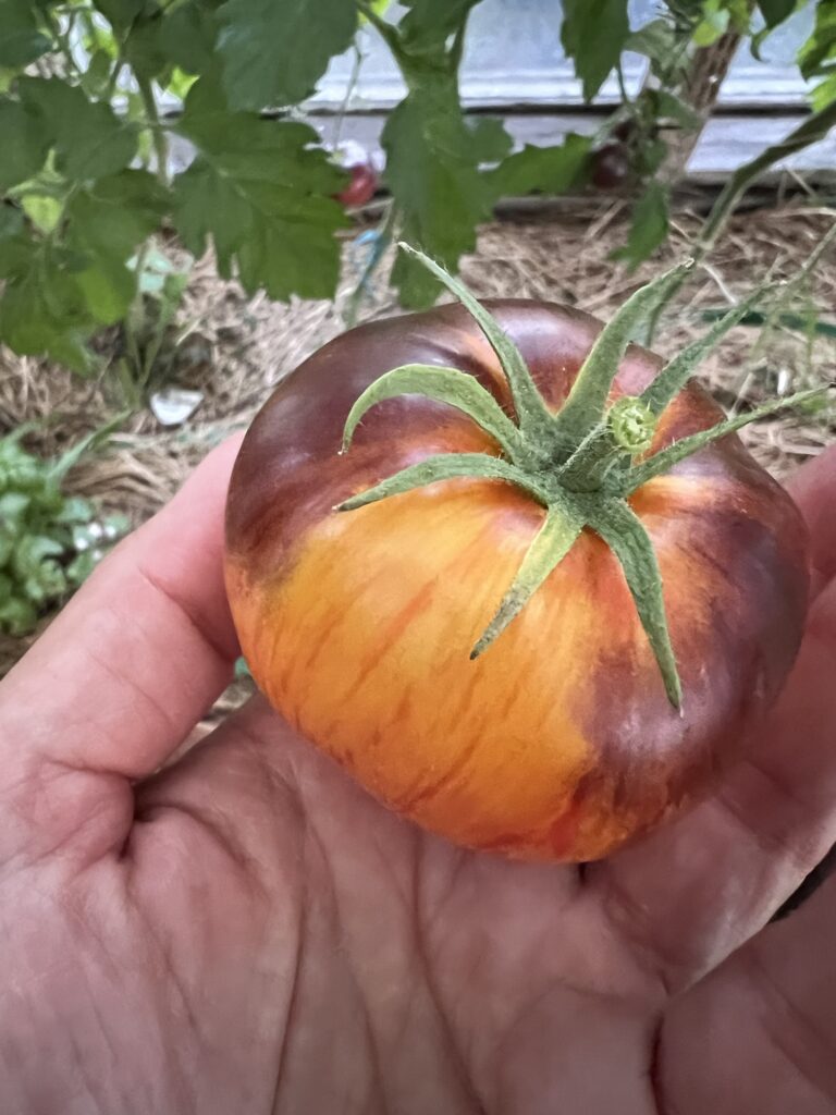 En tomat som jag tappat namnet på men som fått heta Rosa hos mig. Brun-rosa lite speciell med själva ”hållaren” av tomaten är spretig, lik en spindel när tomaten är uppäten. Otroligt god. Kanske min topp-bästa?! 2025 lyckades jag till sist hitta vilken sort det antagligen är; Chocolate Cherry!