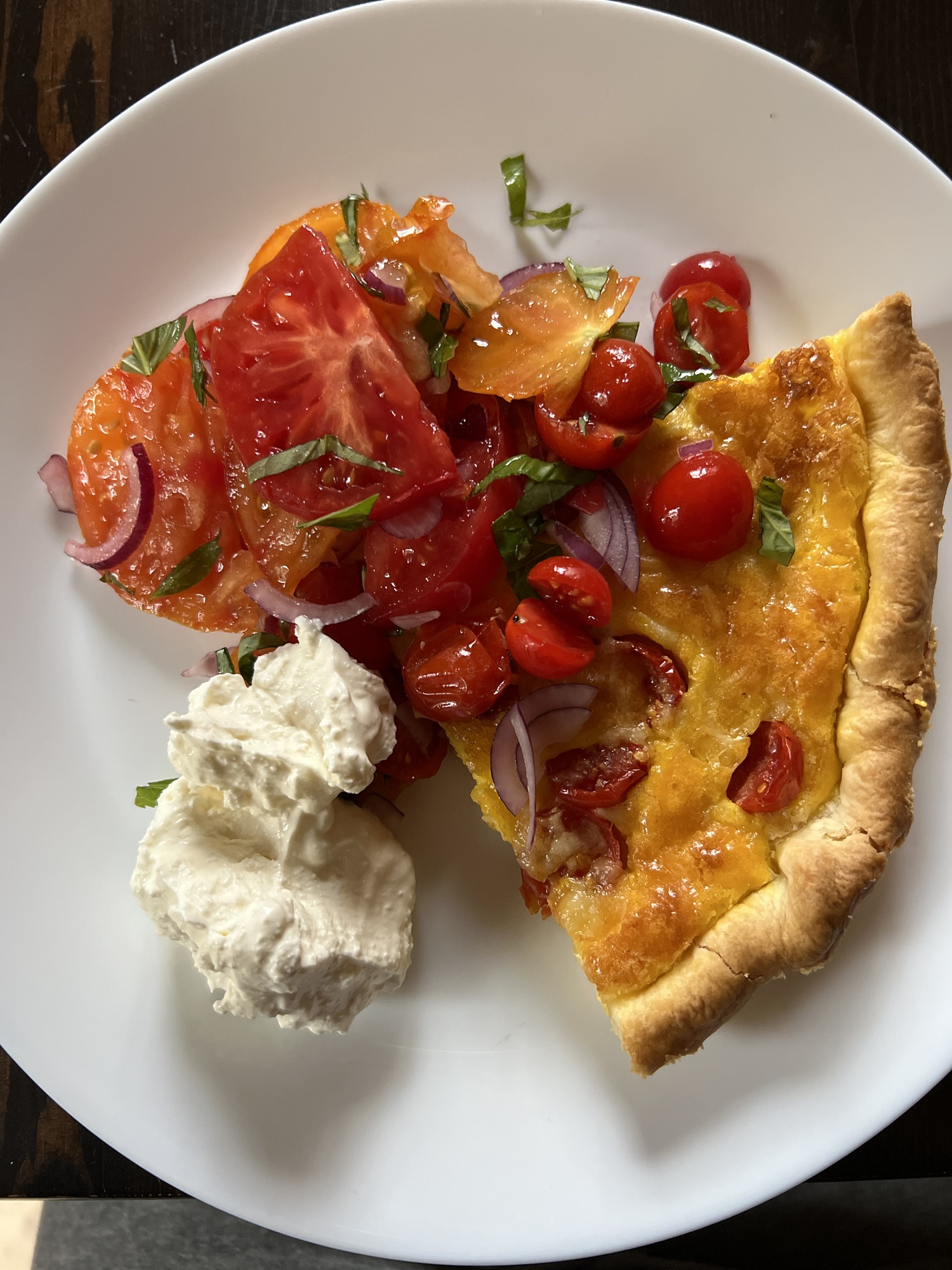 I den tid när man får raceräta tomater och för att njuta av det överflöd man väntat så in i bomben på blev det idag en ost-, bacon och tomatpaj.